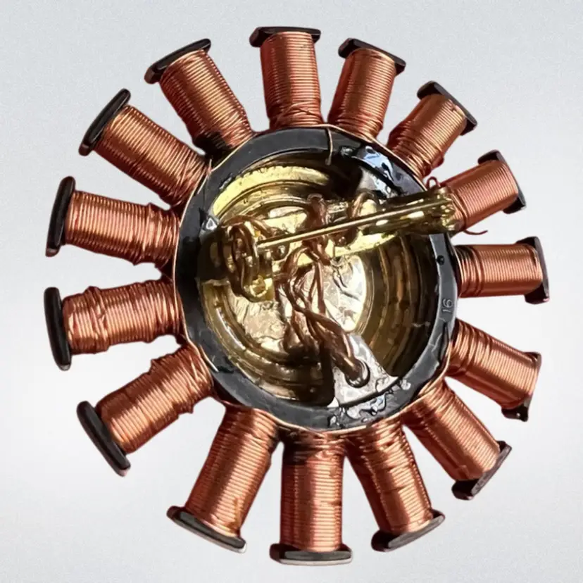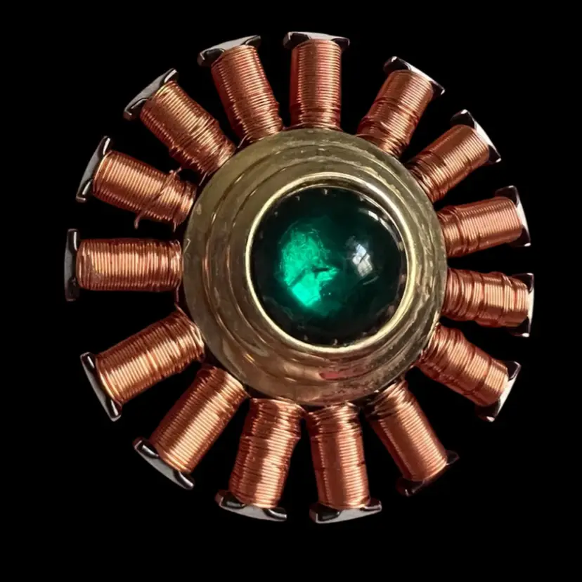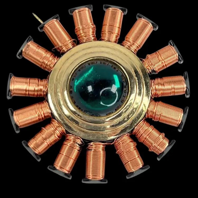 Handmade by me 🫶 Reinvented Brooch Pin 1-5/8” Diameter Recycled electronic e-waste Recycled green glass center from costume jewelry VCR parts; Vibrant Copper Wire Stator