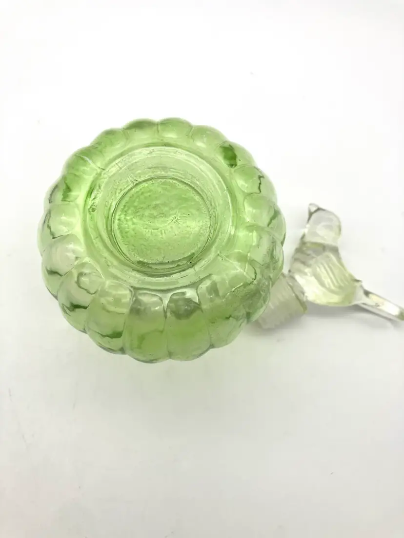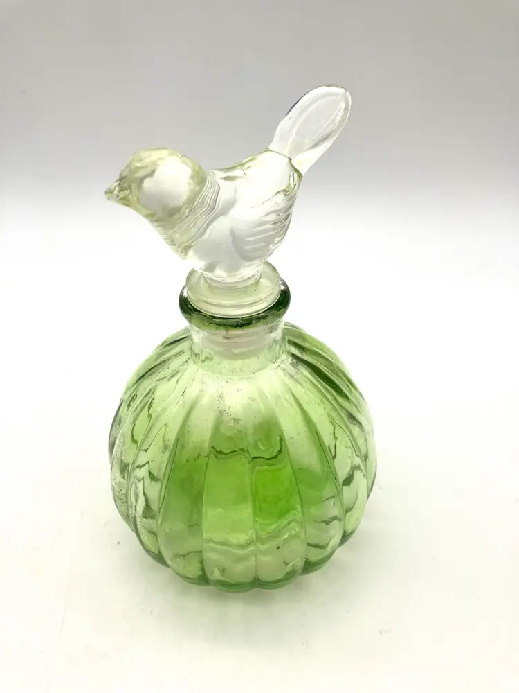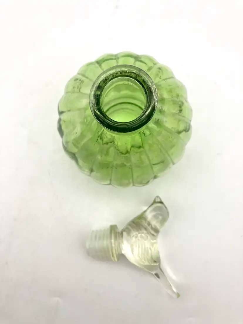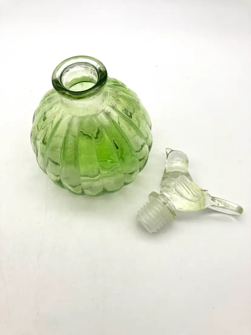 May be more contemporary as stopper has plastic seal around the glass. Measures 5.25” tall and 3.25” diameter. Great condition.