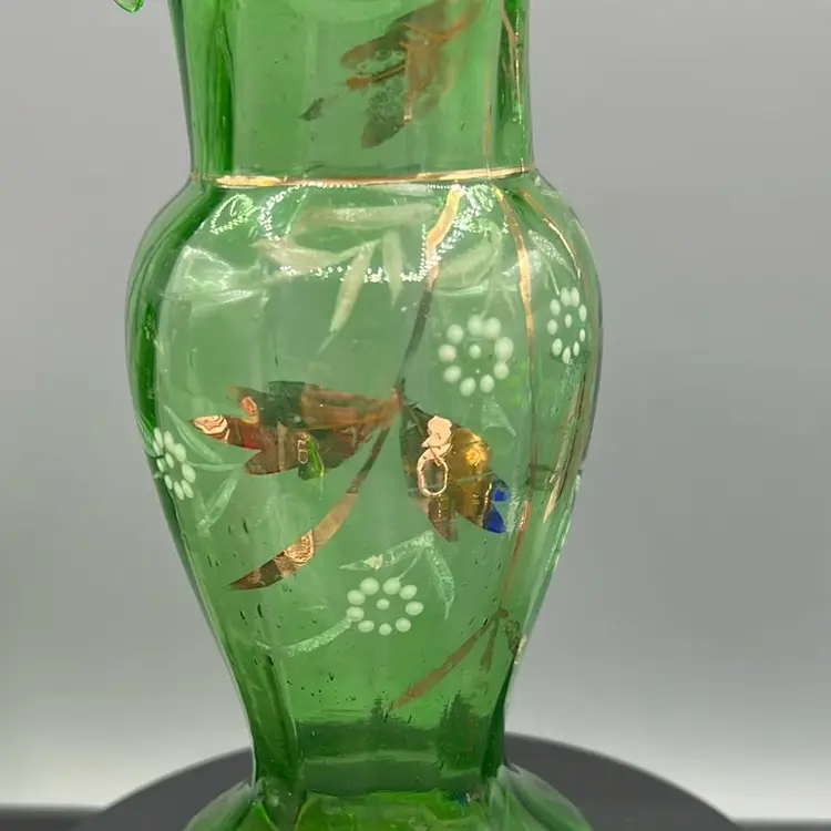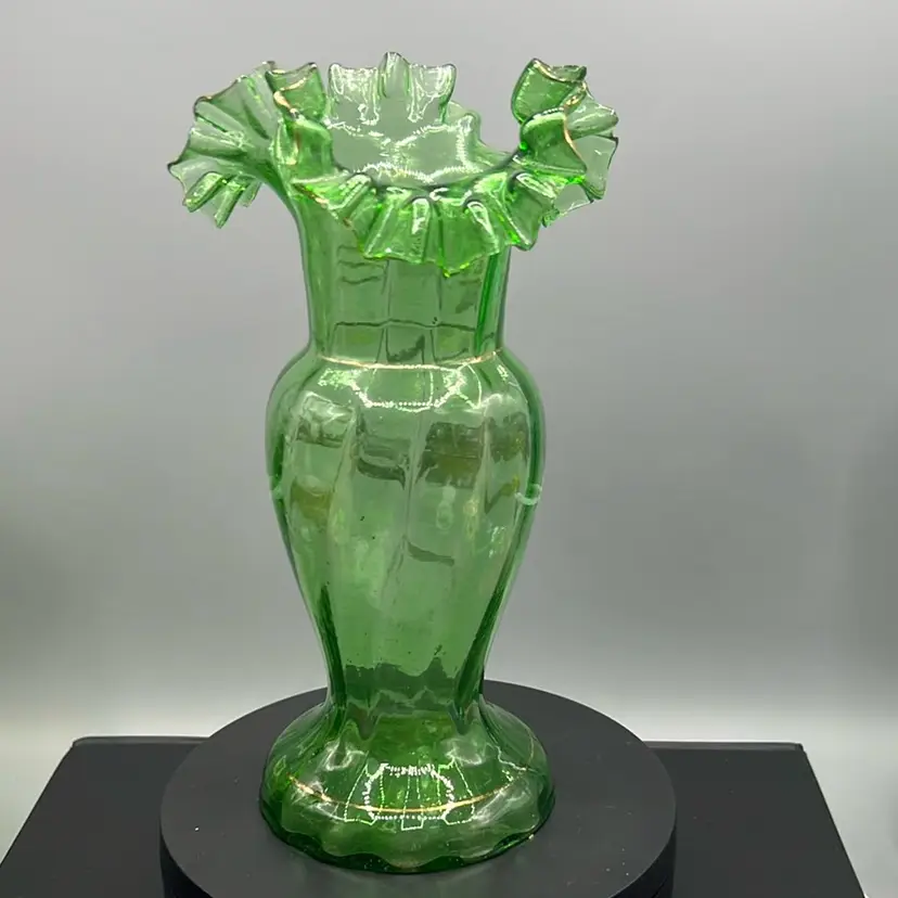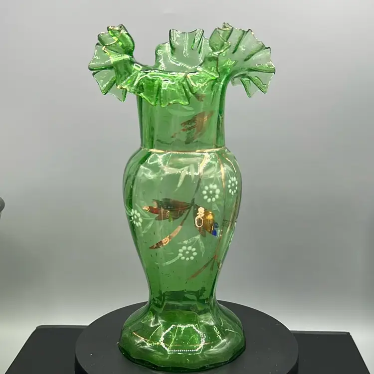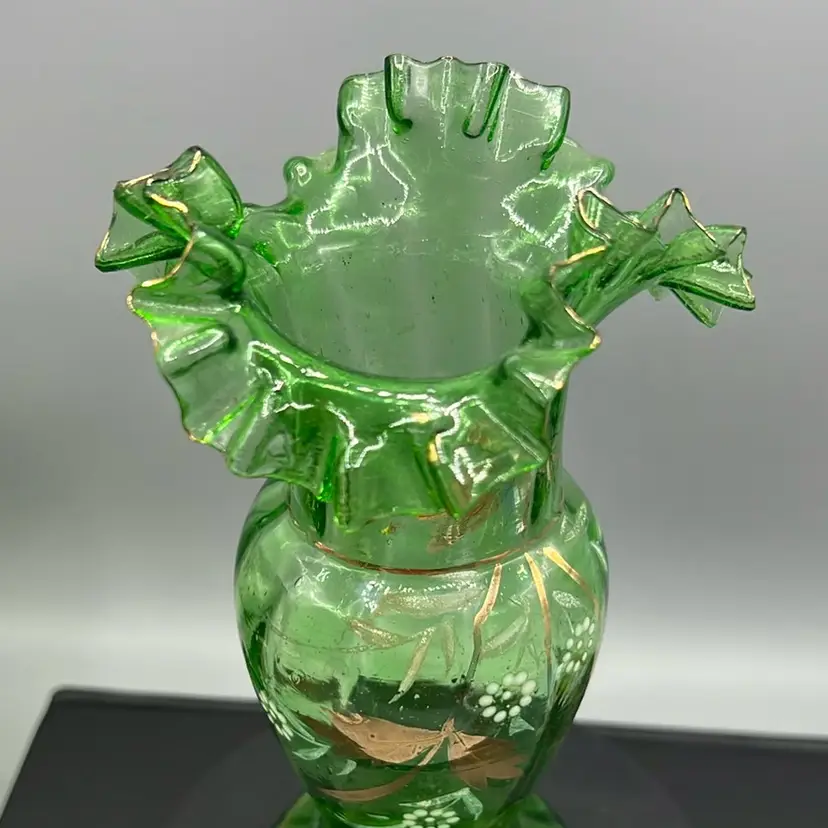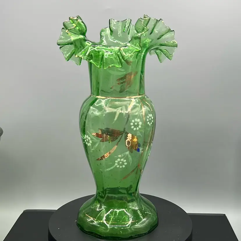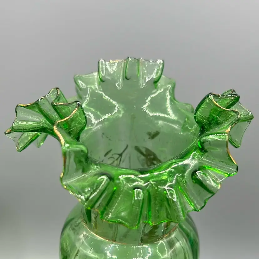 Vintage Art Glass Vase Hand Blown Hand Painted Ruffled Top Gorgeous Green Vase. 8 inches tall