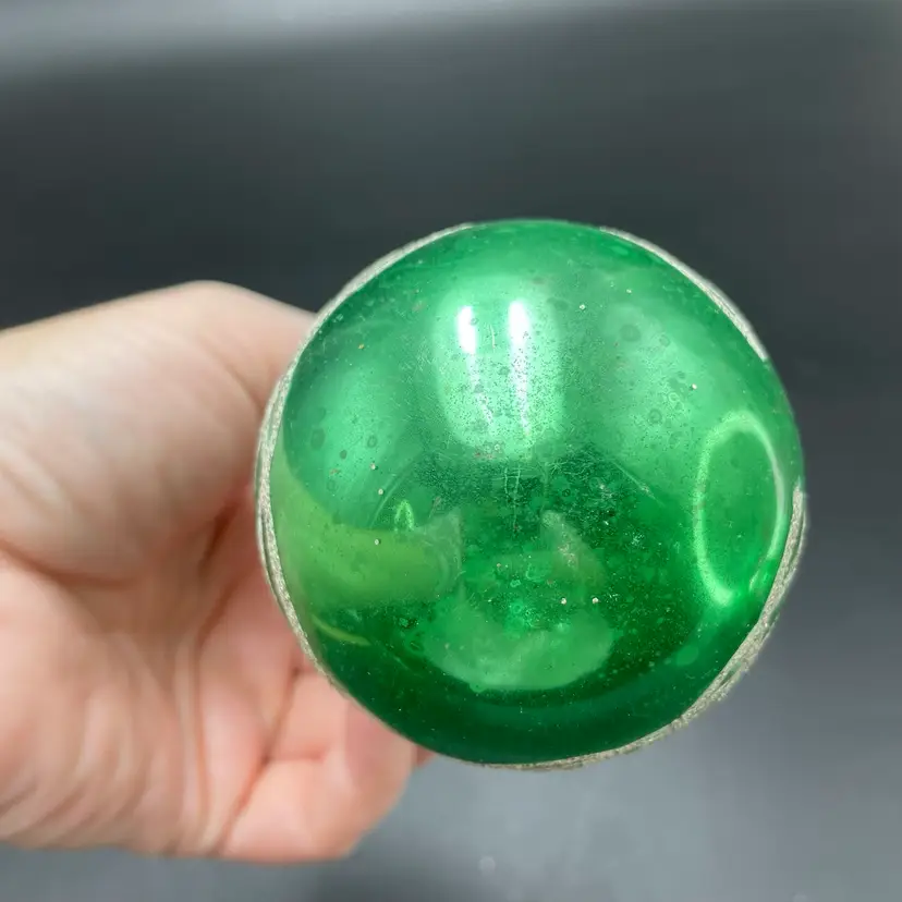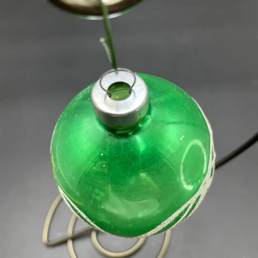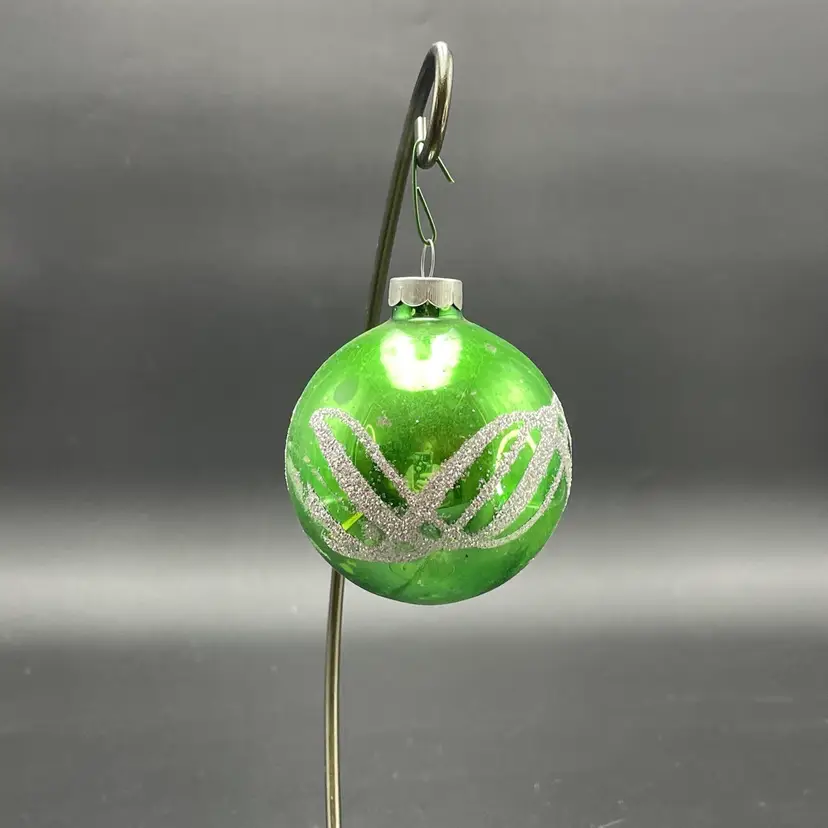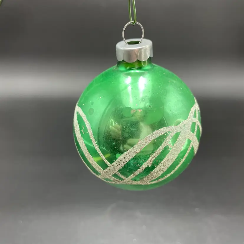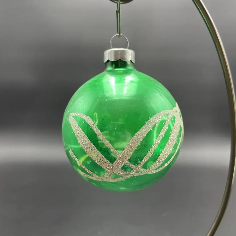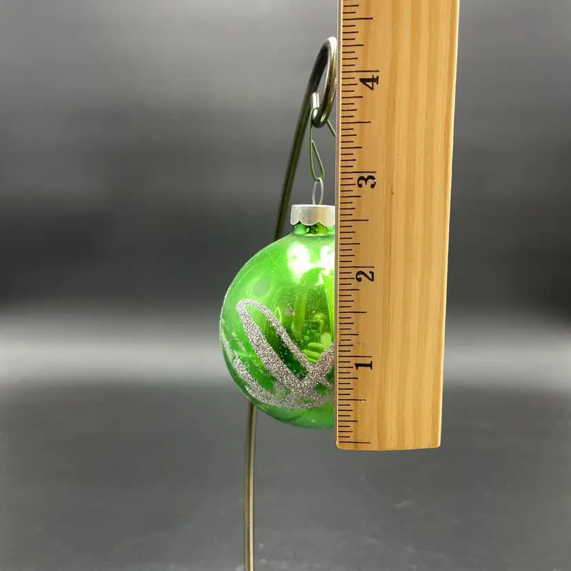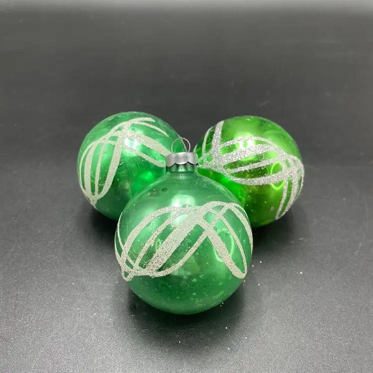 This is a vintage set of 3 green glass with a white glittered stenciled pattern hanging ornaments. Each measure approximately 2.5". There is wear due to age and use on each, such as scratching and glitter loss. No chips or cracks.