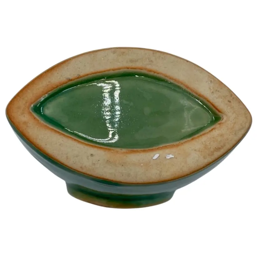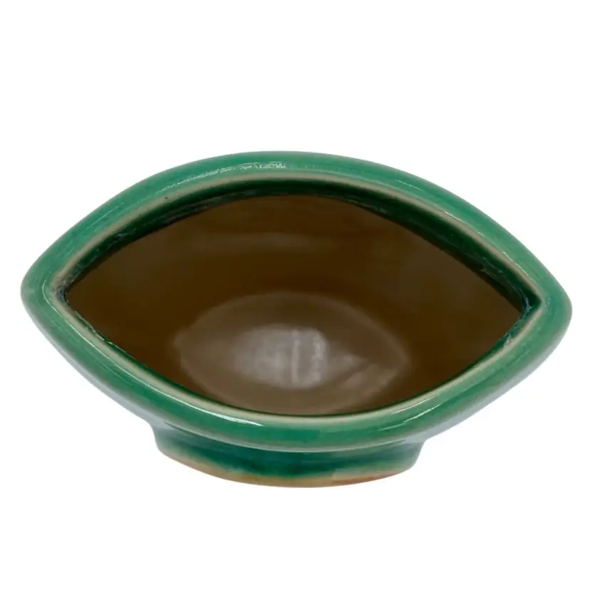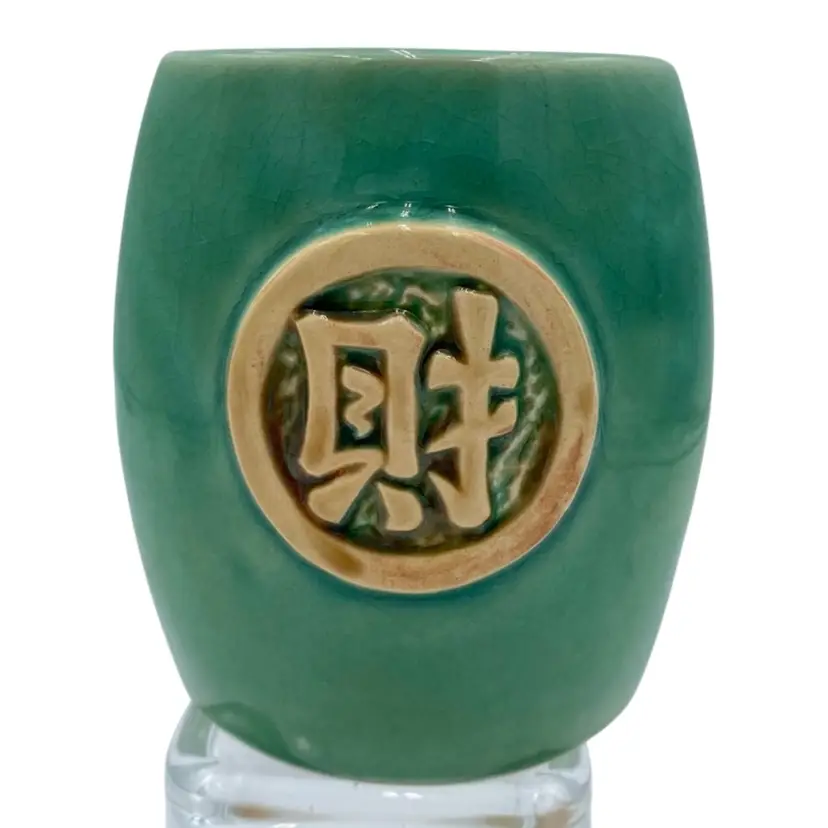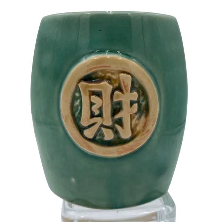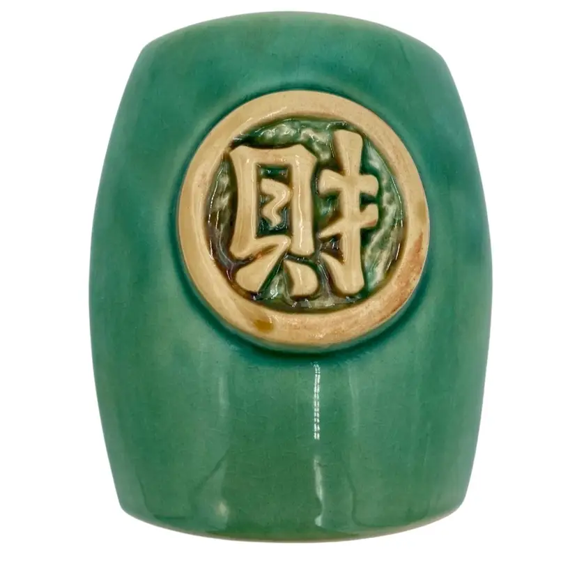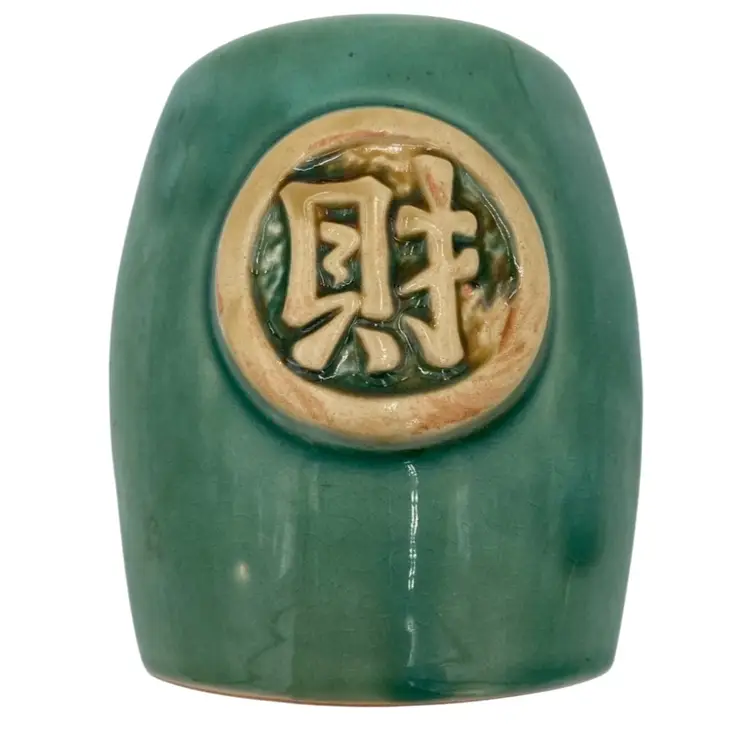 This beautiful green glazed pottery vase features an embossed tan Chinese character for "Wealth" on each side of a crimped oval shape. Made from clay, this vase is suited to display a small bouquet of flowers or to use as a planter for succulents or jade.