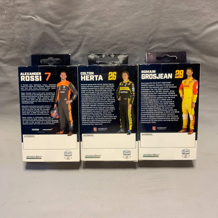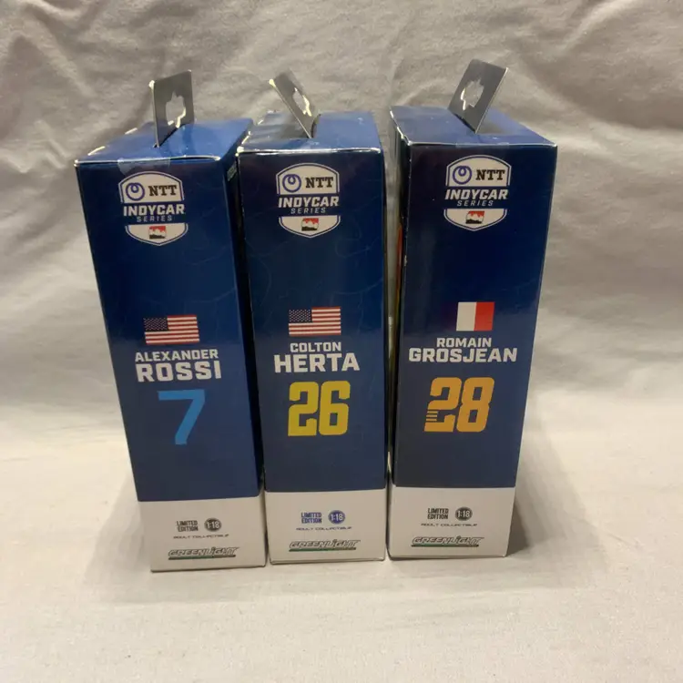 The Green Light Indycar Series 1:18 Driver Figures Lot of 3 is a set of action figures made by the brand Greenlight. Each figure is designed in a green color scheme and is scaled at 1:18. This collection likely includes various characters from the world of Indycar racing, featuring intricate details and accurate representations of the drivers. Perfect for fans of action figures and racing enthusiasts alike, this set offers a realistic and collectible addition to any toy collection.