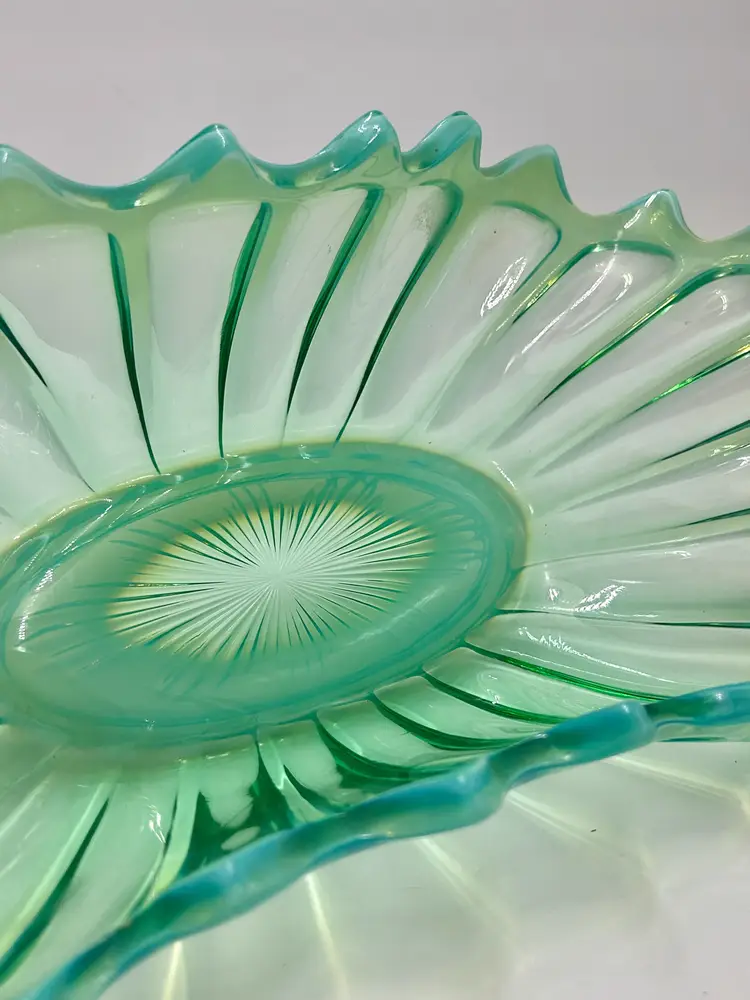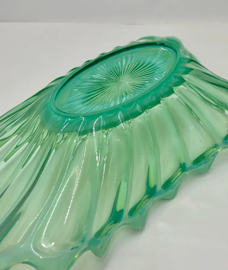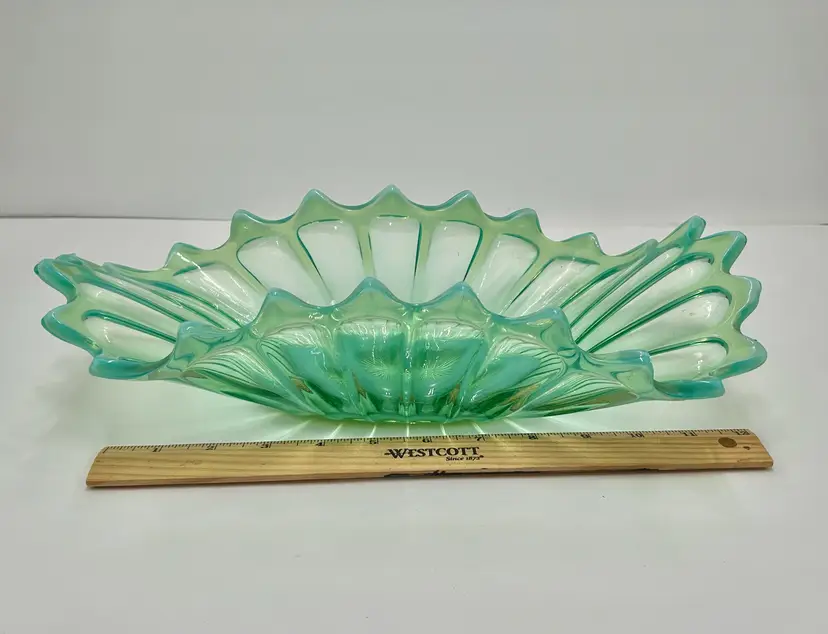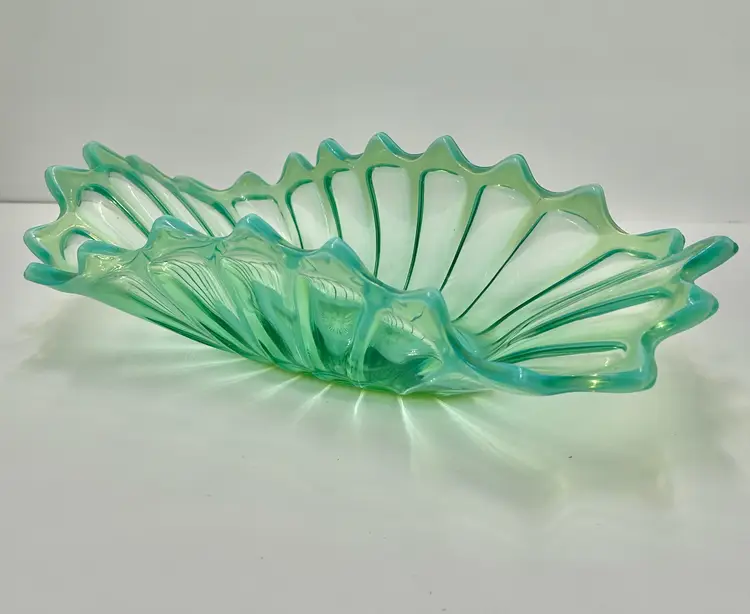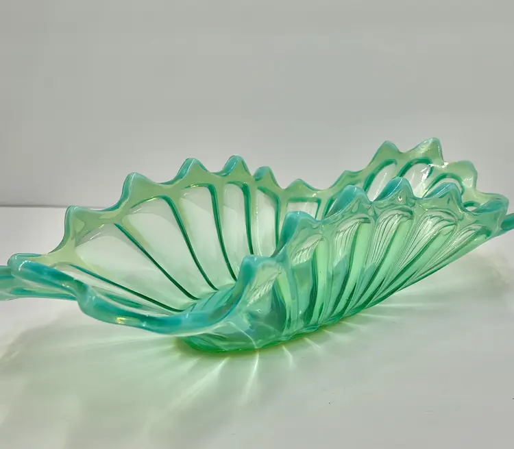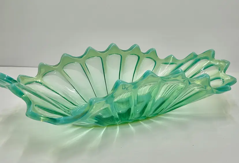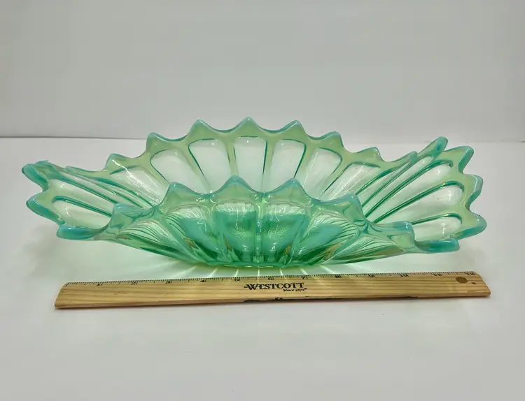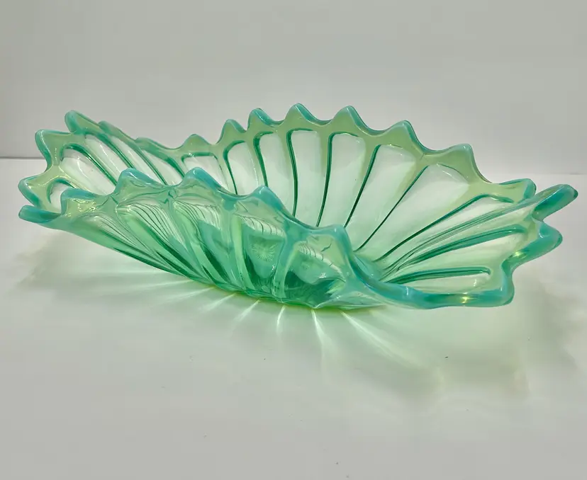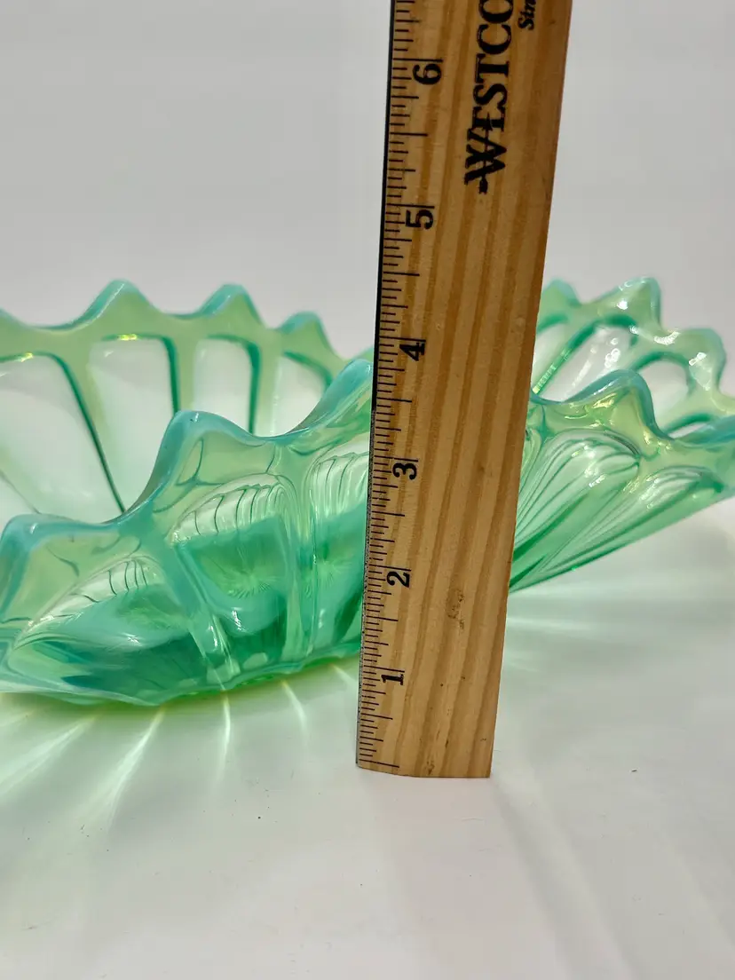 This is one of my favorite pieces of glass and it is 100% the amazing opalescent green color. The bowl is a Fostoria Heirloom piece and it is a large oval oblong shape. The scalloped wing edge has a beautiful opalescence along with the bowl's center. This is the perfect large coffee table centerpiece that will pop from the amazing green color. The bowl is over 12 inches long and about 4 inches tall to the top of one of the tips. It is in great condition with no chips or cracks. We will do our best to double box the piece for safe shipping.