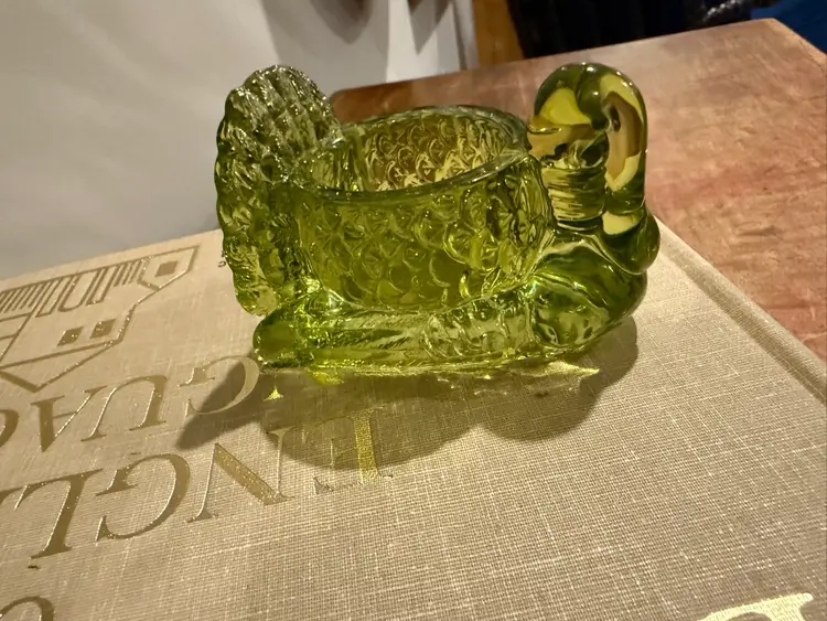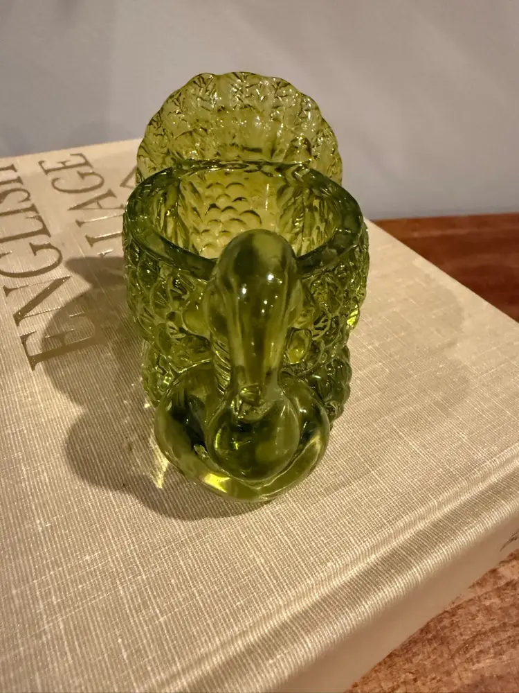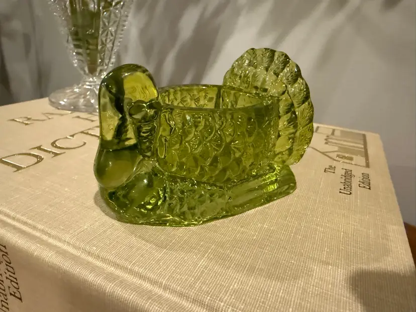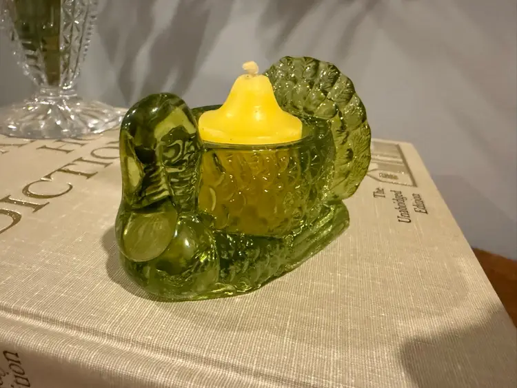 Green pressed glass turkey votive holder, perfect for Thanksgiving or fall decor. This charming piece measures approximately 4 inches in length and features detailed pressed glass work, adding a festive touch to any setting. Ideal for holding small candles or as a decorative accent. Excellent pre-owned condition, no chips or cracks.