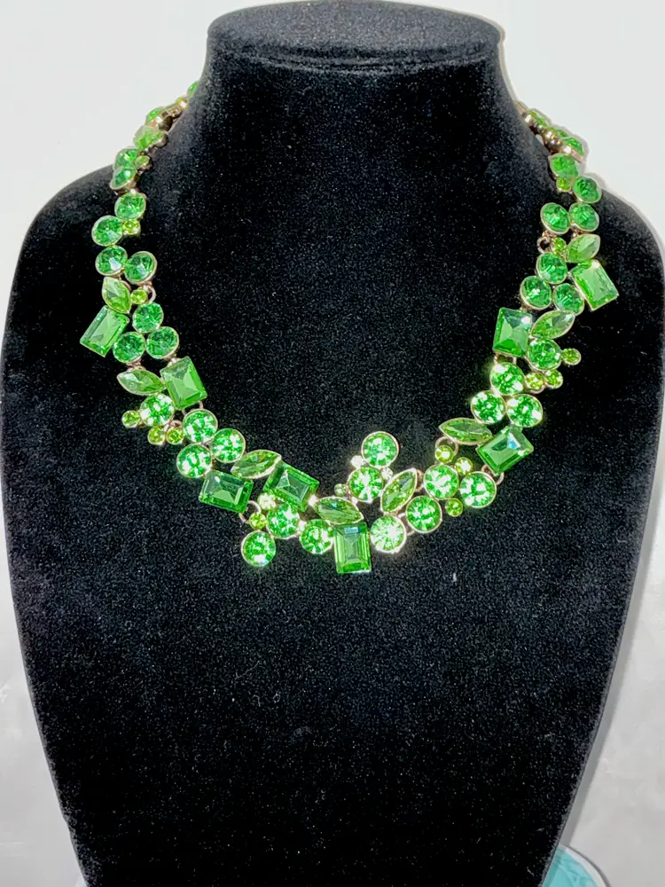 Bold green statement necklace featuring large faceted glass stones in mixed cuts including round, marquise, and rectangular settings. Vibrant color with strong sparkle and open-backed stones for added light reflection. Set in gold tone metal. • Length: 18" • 3" extender chain • Secure lobster clasp • Comfortable, mid-weight statement piece