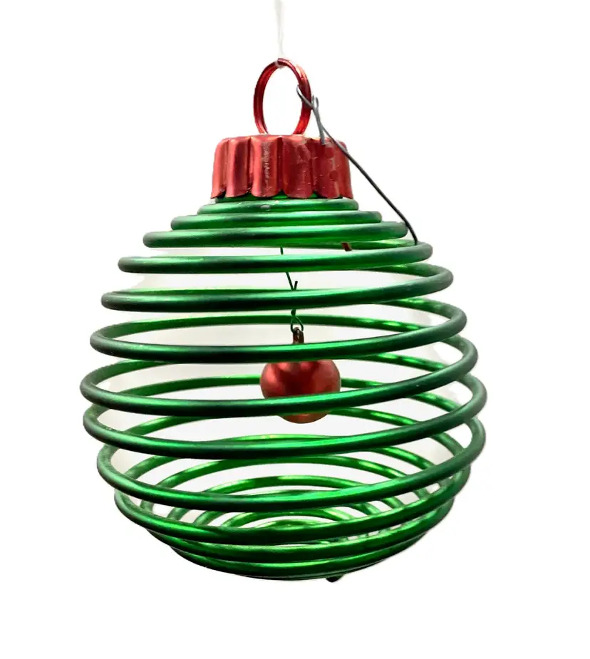 This is a bouncy springy spiral wire, green Christmas ornament with a red jingle bell inside. Very fun ornament for your Christmas tree. In good pre-owned condition. Height: 3 inches.