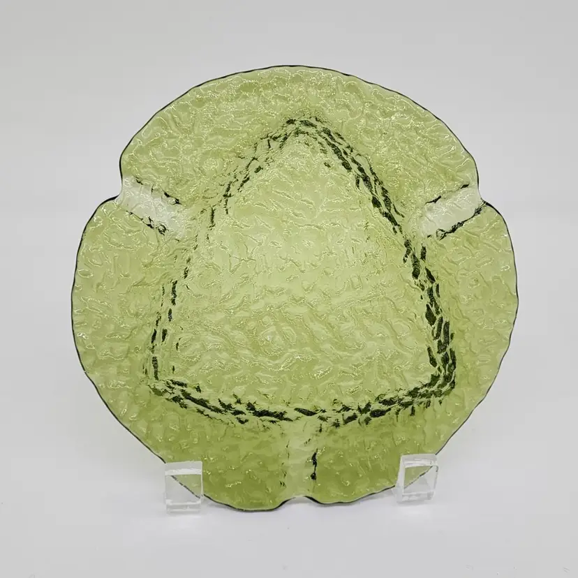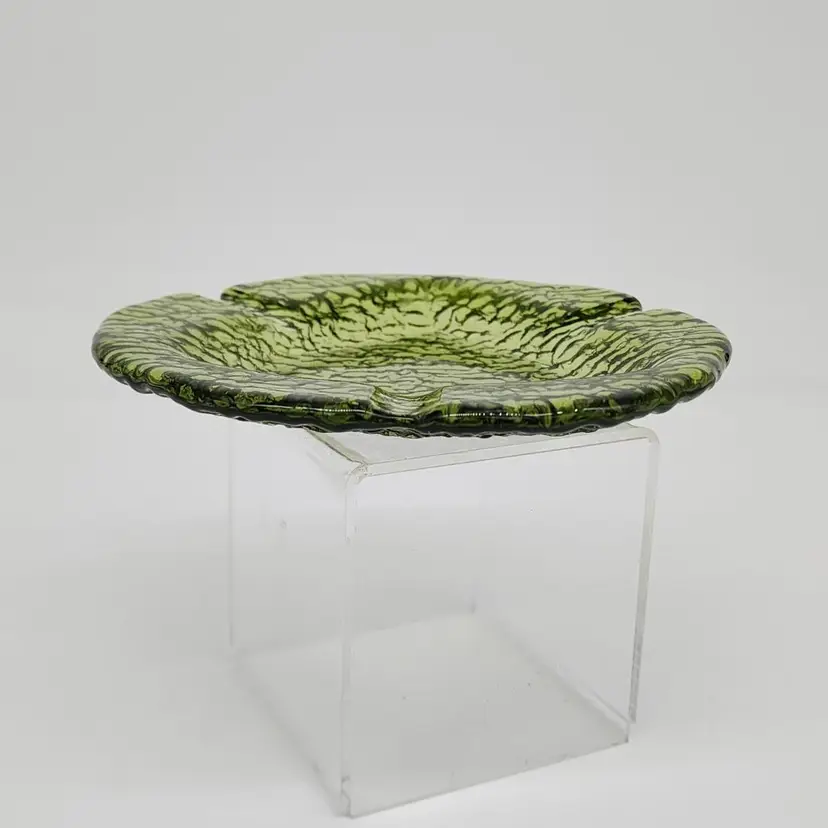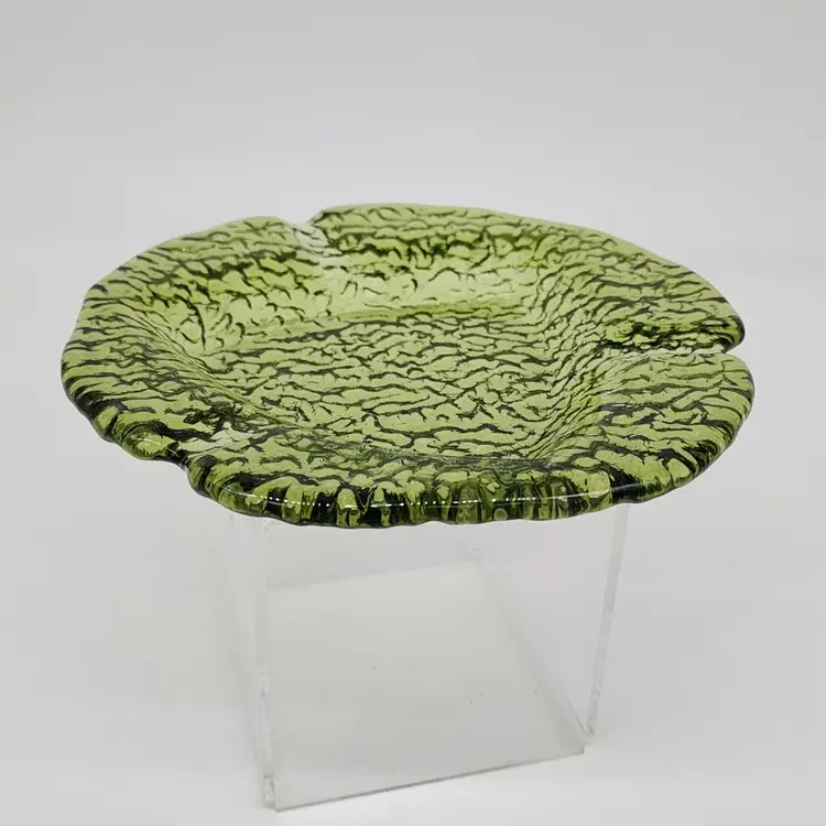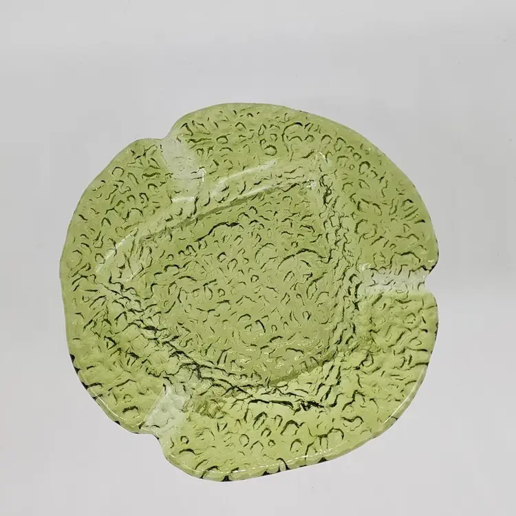 This vintage Green Textured Glass Ashtray Dish showcases a unique, abstract round design with a low base. Its striking aesthetic makes it an ideal centerpiece or functional ashtray. 6.5" Diameter • Vintage green glass material • Textured abstract round design • Low base for stability • Versatile, can be used as an ashtray or centerpiece