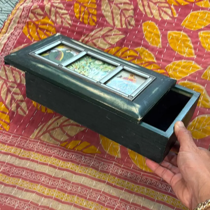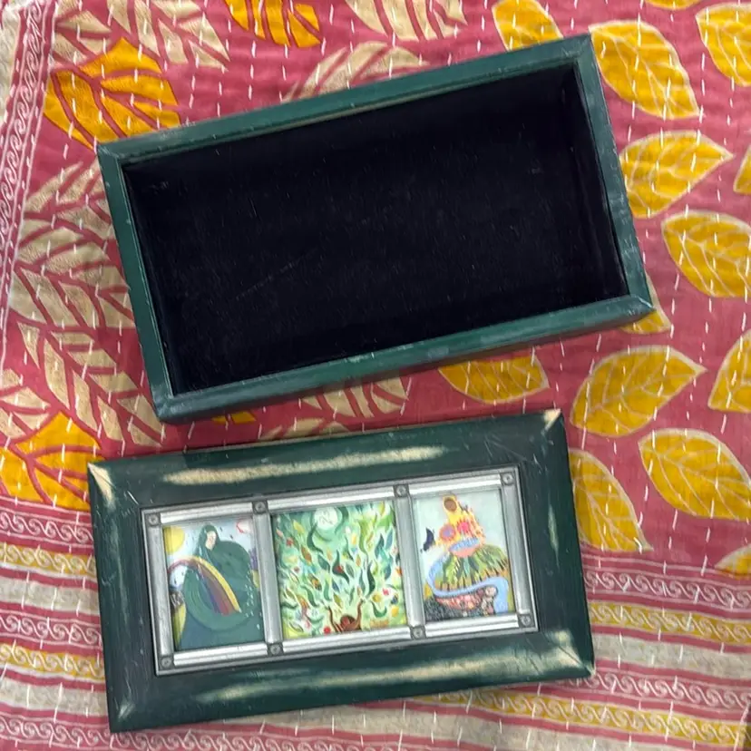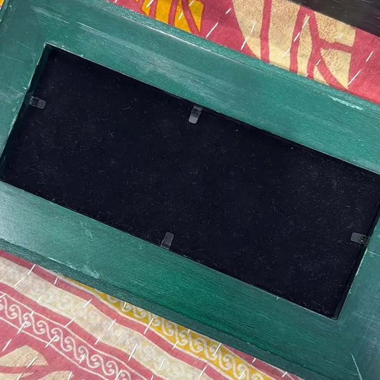 Green wood box with picture frame top. 10” wide, 5.5” deep, 2.5” tall. Natural wear on green paint. Top is a frame so you can easily change out the pictures.