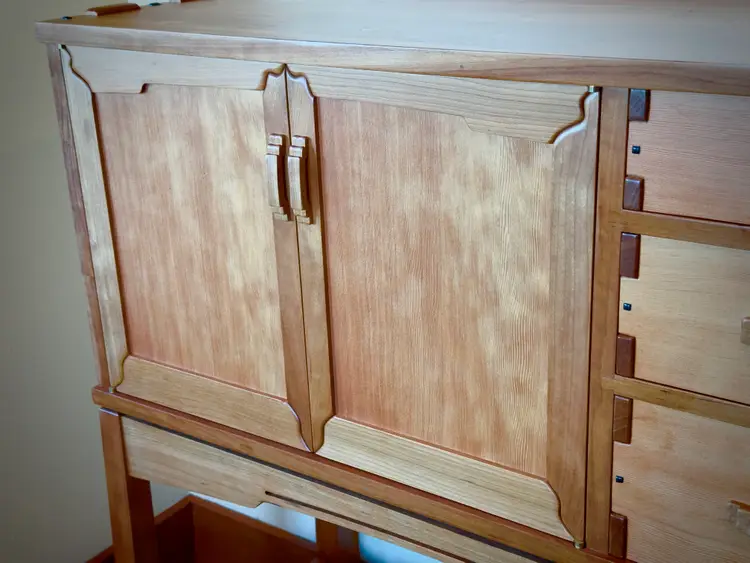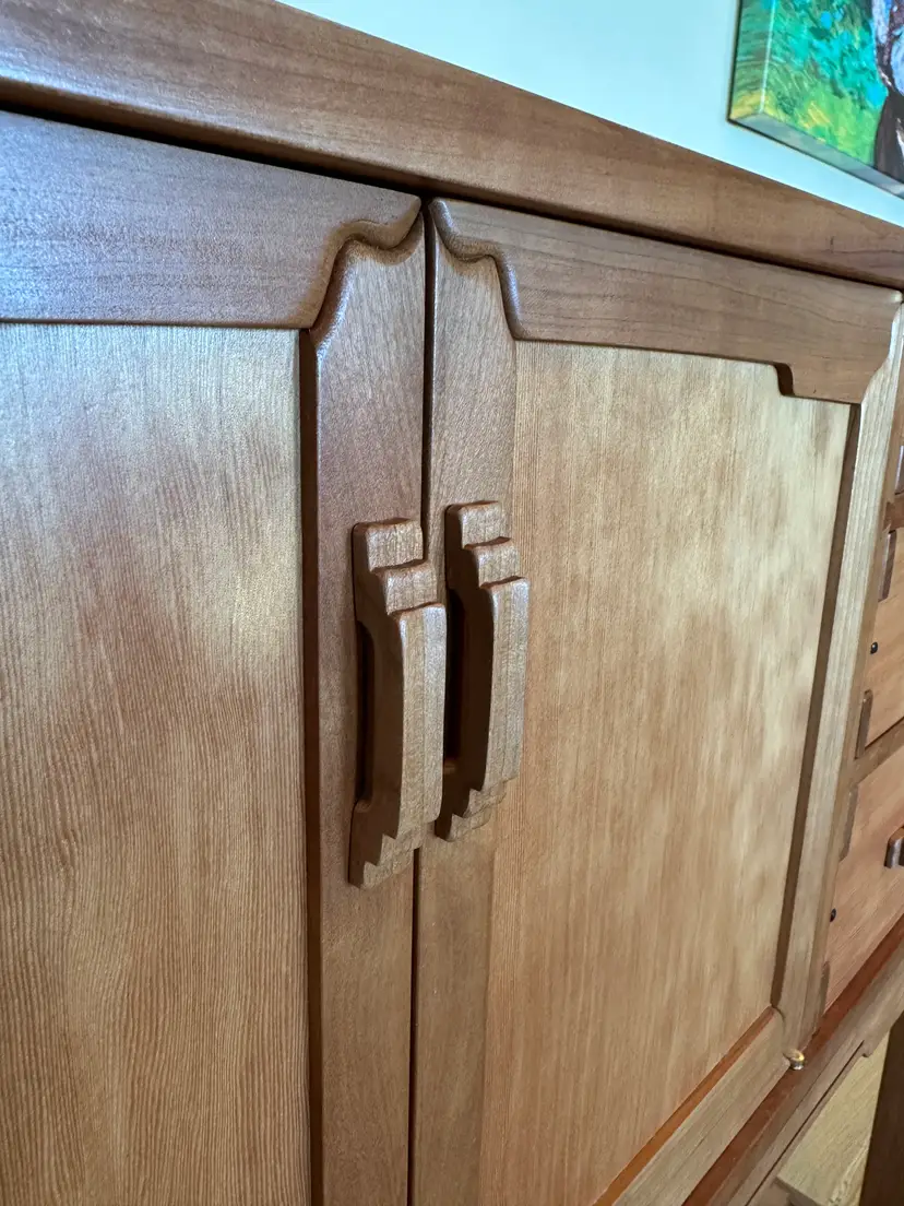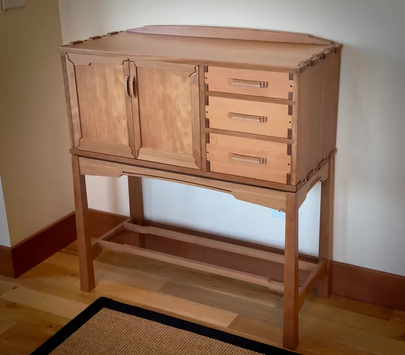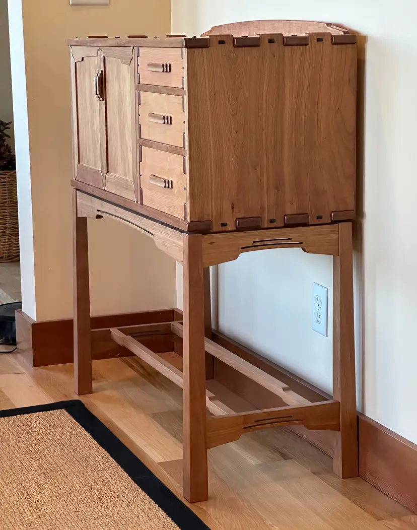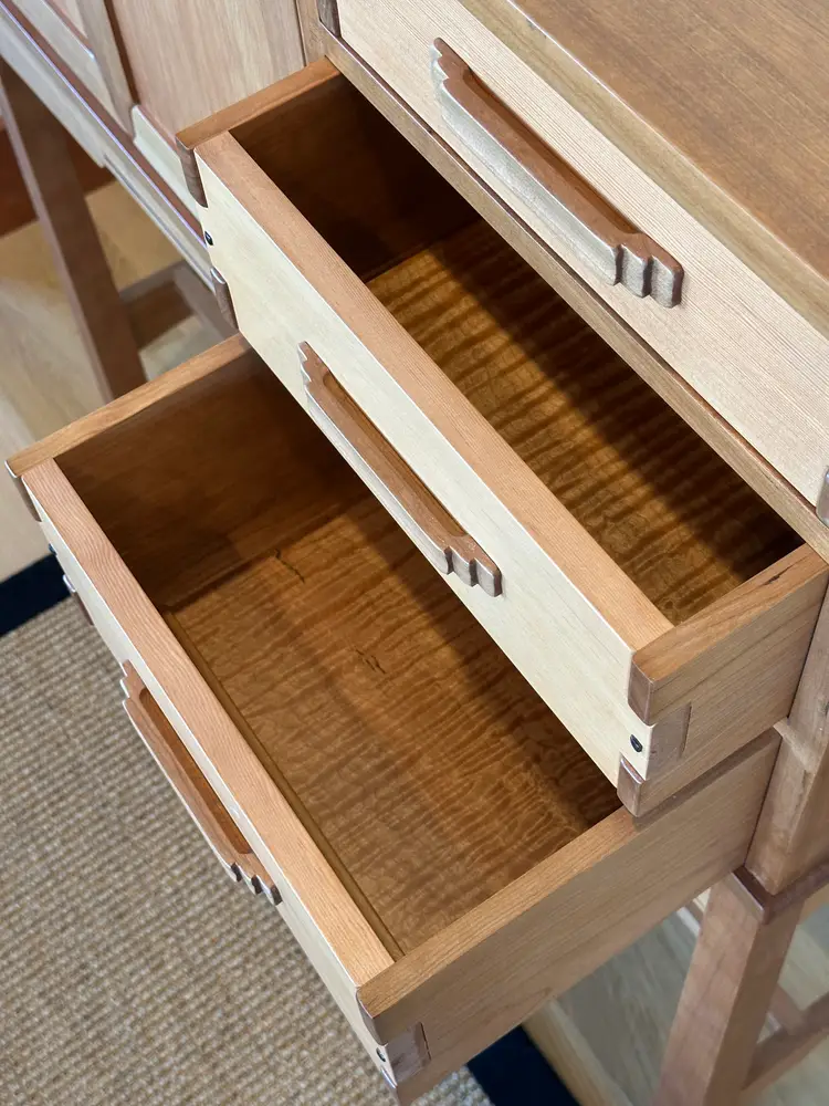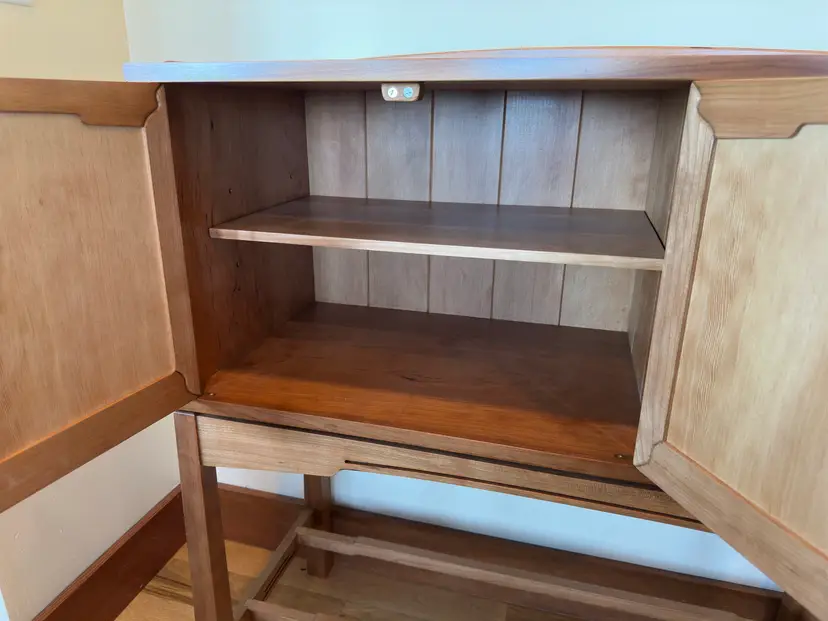 G&G Sideboards made of solid cherry and Douglas fir. Finger jointed cabinet and drawers. Doors feature curved miters that are splined. Behind doors is an adjustable shelf. I have two of these, they are mirror images of each other.