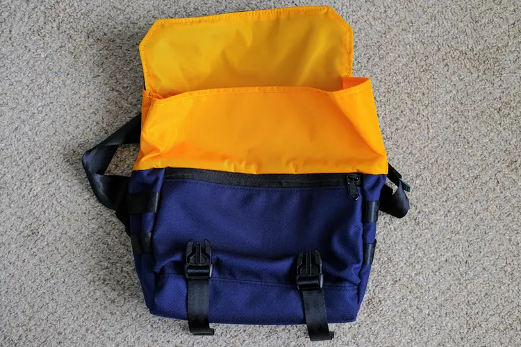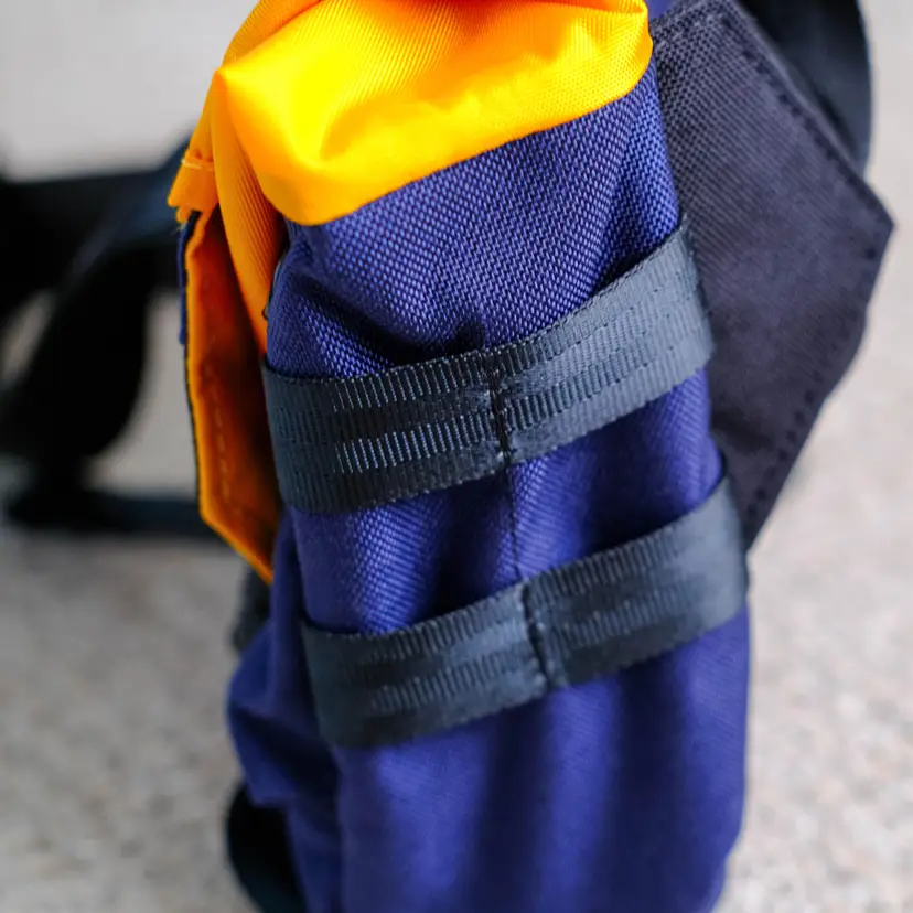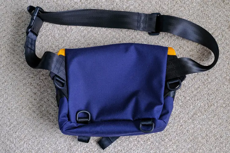 Condition: Excellent (Lightly used and rarely carried. I am very easy on my gear.) Color: Navy Blue Interior Color: Yellow Capacity: 4 Liters (but feels more like 6) Dimensions: 25cm Width x 16cm Height x 10cm Depth Strap Width: 2 inches Materials: 1000D nylon outer, 420D ripstop interior.