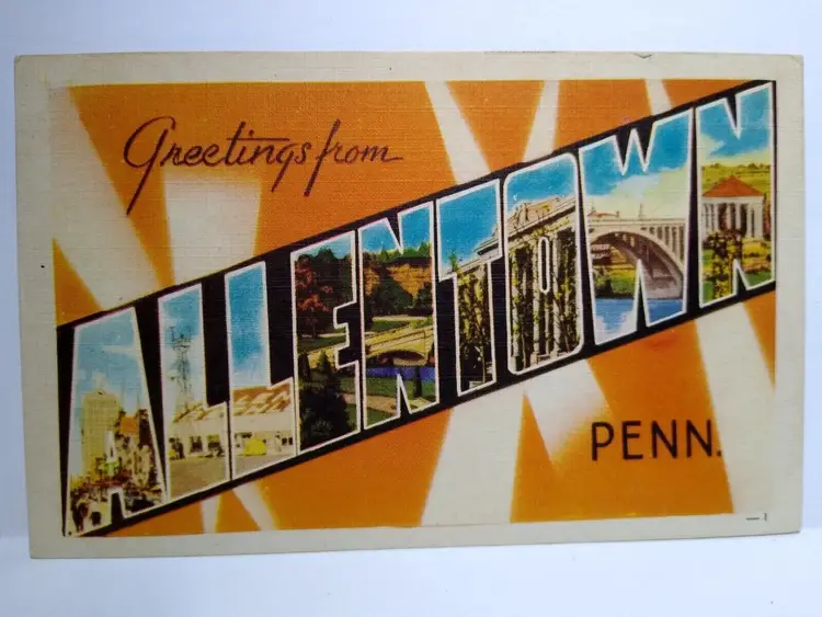 Size: Standard (5.5 x 3.5 in) Custom Bundle: No Continent: North America Region: Pennsylvania Country: USA Type: Linen Postcard Year Manufactured: 1950 Number of Items in Set: 1 Signed: No Original/Licensed Reprint: Original Occasion: Sayings & Quotes City: Allentown Time Period Manufactured: 1930's-1950's Unit of Sale: Single Unit Era: Linen (1930-1945) Artist: Unknown Country/Region of Manufacture: United States Material: Paper Theme: Big Letter, Large Letter, Block Letters, Buildings, Architecture, Greetings Features: Large Letter Postcard, Buildings, Scenic, Greetings, Greetings From, Big Letter, Linen Postcard Subject: Greetings From Postage Condition: Unposted Brand/Publisher: Dexter Franchise: Unknown