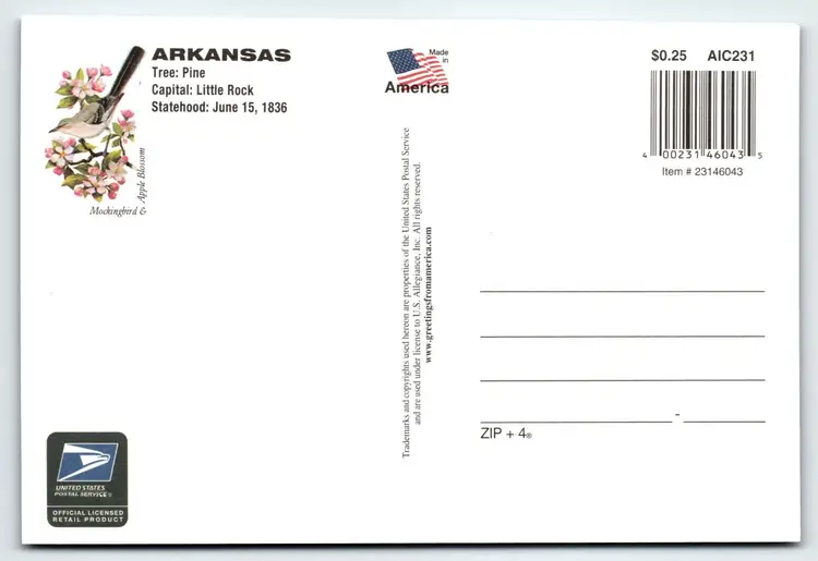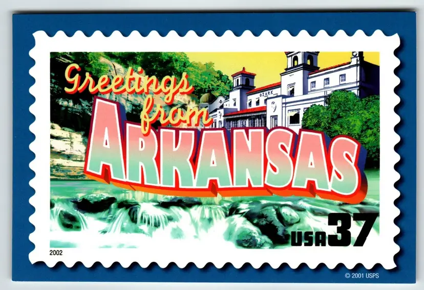 Number of Items in Set: 1 Unit of Sale: Single Unit Artist: Unknown Occasion: Sayings & Quotes Size: Continental (6 x 4 in) Signed: No Custom Bundle: No Year Manufactured: 2001 Material: Paper City: Multi Original/Licensed Reprint: Original Franchise: None Brand/Publisher: USPS Subject: Large Letter Greetings Continent: North America Type: Printed (Lithograph) Era: Photochrome (1939-Now) Region: Arkansas Country: USA Theme: Greetings, Large Letter, Roadside America, Stamps, States, Tourism, Travel, USPS Features: Chrome Time Period Manufactured: 2000-2009 Country/Region of Manufacture: United States Postage Condition: Unposted