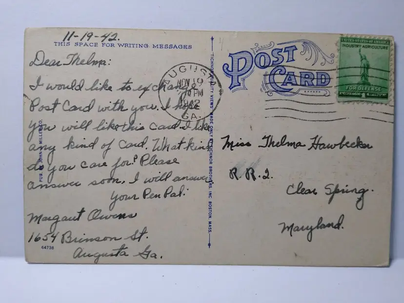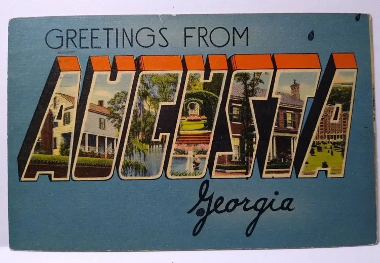Size: Standard (5.5 x 3.5 in) Custom Bundle: No Continent: North America Region: Georgia Country: USA Type: Linen Postcard Year Manufactured: 1942 Number of Items in Set: 1 Signed: No Original/Licensed Reprint: Original Occasion: Sayings & Quotes City: Augusta Time Period Manufactured: 1930's-1950's Unit of Sale: Single Unit Era: Linen (1930-1945) Artist: Unknown Country/Region of Manufacture: United States Material: Paper Theme: Big Letter, Large Letter, Block Letters, Trees, Agriculture, Cities & Towns, Greetings Features: Large Letter Postcard, Cities, Towns, Divided Back Subject: Large Letter Postage Condition: Posted Brand/Publisher: Tichnor Brothers Franchise: None