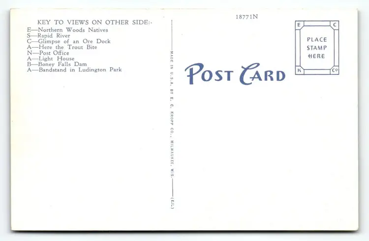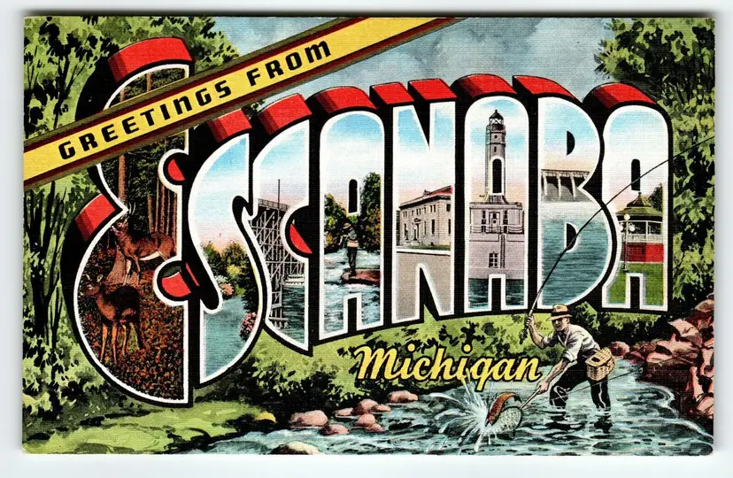 Number of Items in Set: 1 Unit of Sale: Single Unit Artist: Unknown Occasion: Sayings & Quotes Size: Standard (5.5 x 3.5 in) Signed: No Custom Bundle: No Year Manufactured: 1940 Material: Paper City: Escanaba Original/Licensed Reprint: Original Franchise: Unknown Brand/Publisher: EC Kropp Subject: Greetings Continent: North America Type: Linen Postcard Era: Post-War (1945-Now) Region: Michigan Country: USA Theme: Cities & Towns, Greetings, Large Letter, States Features: Large Letter Postcard, Greetings, Greetings From, Big Letter Time Period Manufactured: 1930's-1950's Country/Region of Manufacture: United States Postage Condition: Unposted
