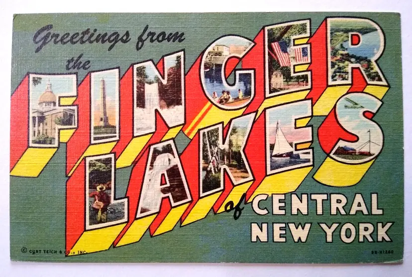 Number of Items in Set: 1 Unit of Sale: Single Unit Artist: Unknown Occasion: Sayings & Quotes Size: Standard (5.5 x 3.5 in) Signed: No Custom Bundle: No Year Manufactured: 1945 Material: Paper City: Finger Lakes Original/Licensed Reprint: Original Franchise: None Brand/Publisher: Curt Teich Subject: Large Letter Continent: North America Type: Linen Postcard Era: Linen (1930-1945) Region: New York Country: USA Theme: Agriculture, Cities & Towns, Greetings, Roadside America, Tourism, Travel, Big Letter, Large Letter, Block Letters, Buildings Features: Large Letter Postcard Time Period Manufactured: 1930's-1950's Country/Region of Manufacture: United States Postage Condition: Unposted