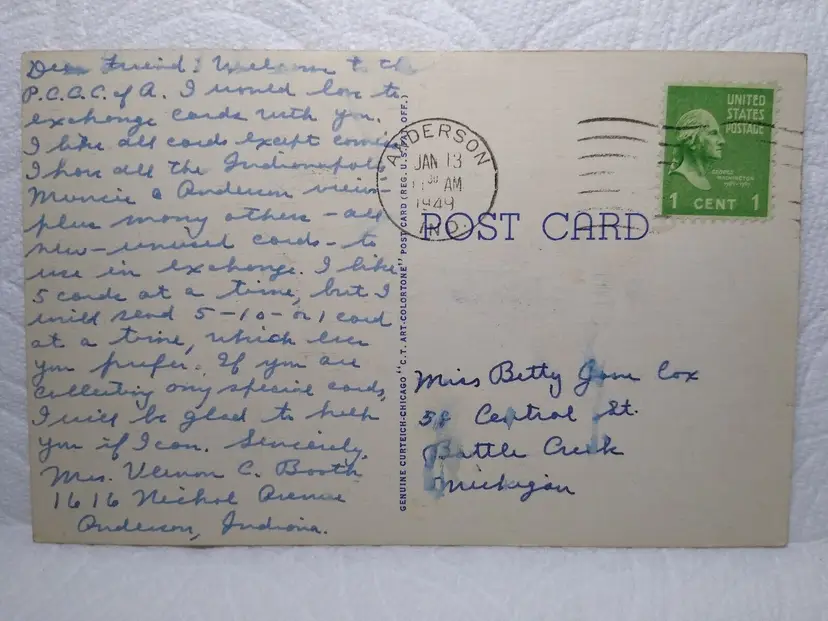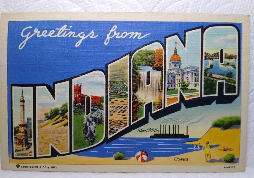 Number of Items in Set: 1 Unit of Sale: Single Unit Artist: Unknown Occasion: Sayings & Quotes Size: Standard (5.5 x 3.5 in) Signed: No Custom Bundle: No Year Manufactured: 1949 Material: Paper City: Multi Original/Licensed Reprint: Original Franchise: Unknown Brand/Publisher: Curt Teich Subject: Greetings Continent: North America Type: Linen Postcard Era: Post-War (1945-Now) Region: Indiana Country: USA Theme: Architecture, Cities & Towns, Greetings, Landscapes, Social History, Big Letter, Large Letter, Block Letters, Buildings Features: Large Letter Postcard, Greetings, Greetings From, Big Letter Time Period Manufactured: 1930's-1950's Country/Region of Manufacture: United States Postage Condition: Posted