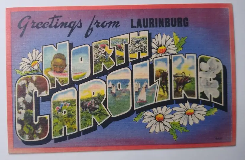 Number of Items in Set: 1 Unit of Sale: Single Unit Artist: Unknown Occasion: Sayings & Quotes Size: Standard (5.5 x 3.5 in) Signed: No Custom Bundle: No Year Manufactured: 1943 Material: Paper City: Laurinburg Original/Licensed Reprint: Original Franchise: None Brand/Publisher: Colourpicture Subject: Large Letter Continent: North America Type: Linen Postcard Era: Linen (1930-1945) Region: North Carolina Country: USA Theme: Agriculture, Architecture, Big Letter, Block Letters, Cities & Towns, Flowers & Plants, Greetings, Large Letter, Roadside America, Tourism, Travel Features: Divided Back, Large Letter Postcard, Cities, Towns Time Period Manufactured: 1930's-1950's Country/Region of Manufacture: United States Postage Condition: Unposted