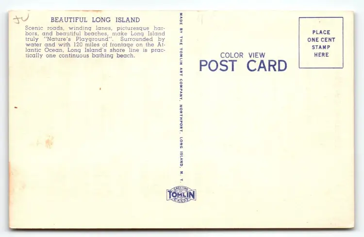 Number of Items in Set: 1 Unit of Sale: Single Unit Artist: Unknown Occasion: Sayings & Quotes Size: Standard (5.5 x 3.5 in) Signed: No Custom Bundle: No Year Manufactured: 1951 Material: Paper City: Long Island Original/Licensed Reprint: Original Franchise: None Brand/Publisher: Tomlin Subject: Large Letter Continent: North America Type: Linen Postcard Era: Linen (1930-1945) Region: New York Country: USA Theme: Agriculture, Architecture, Big Letter, Block Letters, Cities & Towns, Greetings, Large Letter, Social History, Tourism, Travel Features: Divided Back, Large Letter Postcard, Cities, Towns Time Period Manufactured: 1930's-1950's Country/Region of Manufacture: United States Postage Condition: Unposted