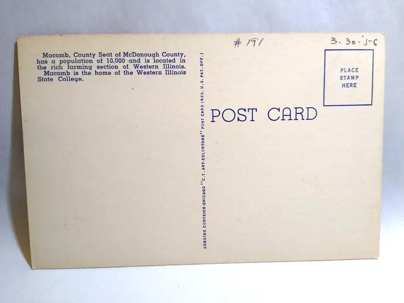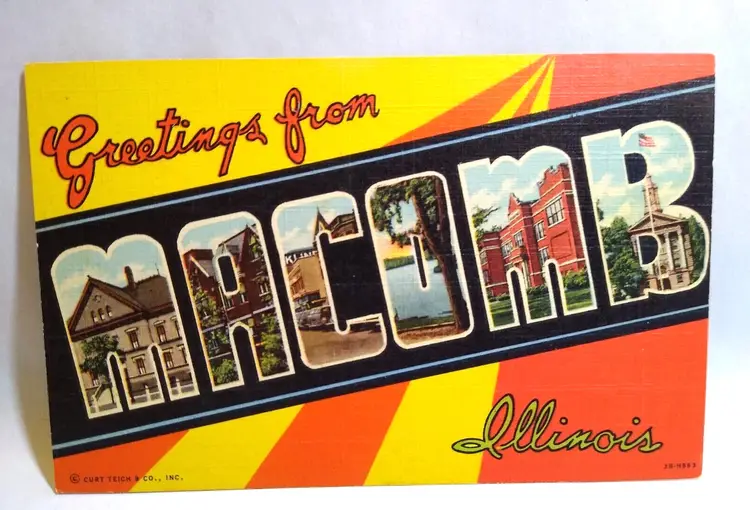Number of Items in Set: 1 Unit of Sale: Single Unit Artist: Unknown Occasion: Sayings & Quotes Size: Standard (5.5 x 3.5 in) Signed: No Custom Bundle: No Year Manufactured: 1940 Material: Paper City: Macomb Original/Licensed Reprint: Original Franchise: None Brand/Publisher: Curt Teich Subject: Large Letter Continent: North America Type: Printed (Lithograph) Era: Linen (1930-1945) Region: Illinois Country: United States Theme: Agriculture, Architecture, Art, Cities & Towns, Cowboys & Western, Greetings, Roadside America, Tourism, Travel, Big Letter, Large Letter, Block Letters Features: Large Letter Postcard, Divided Back Time Period Manufactured: 1930's-1950's Country/Region of Manufacture: United States Postage Condition: Unposted