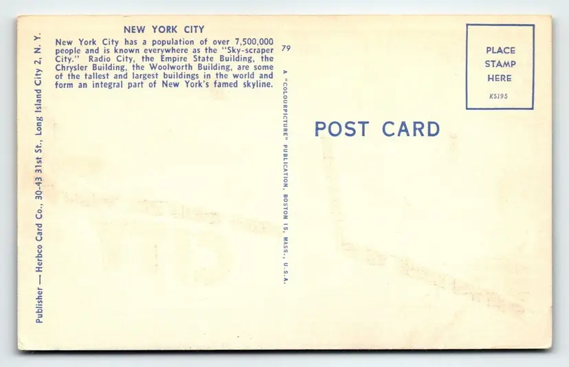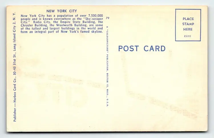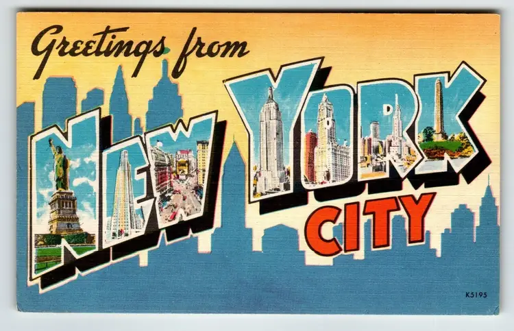 Number of Items in Set: 1 Unit of Sale: Single Unit Artist: Unknown Occasion: Sayings & Quotes Size: Standard (5.5 x 3.5 in) Signed: No Custom Bundle: No Year Manufactured: 1943 Material: Paper City: New York City Original/Licensed Reprint: Original Franchise: None Brand/Publisher: Colourpicture Subject: Large Letter Continent: North America Type: Linen Postcard Era: Linen (1930-1945) Region: New York Country: USA Theme: Cities & Towns Features: Large Letter Postcard Time Period Manufactured: 1930's-1950's Country/Region of Manufacture: United States Postage Condition: Unposted