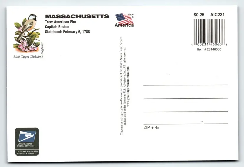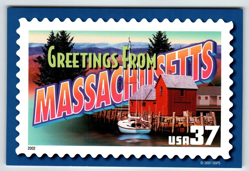 Number of Items in Set: 1 Unit of Sale: Single Unit Artist: Unknown Occasion: Sayings & Quotes Size: Continental (6 x 4 in) Signed: No Custom Bundle: No Year Manufactured: 2001 Material: Paper City: Multi Original/Licensed Reprint: Original Franchise: None Brand/Publisher: USPS Subject: Large Letter Greetings Continent: North America Type: Printed (Lithograph) Era: Photochrome (1939-Now) Country: USA Theme: Greetings, Large Letter, Roadside America, Stamps, States, Tourism, Travel, USPS Region: Massachusetts Features: Chrome Time Period Manufactured: 2000-2009 Country/Region of Manufacture: United States Postage Condition: Unposted