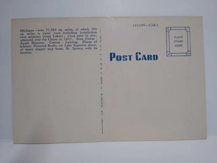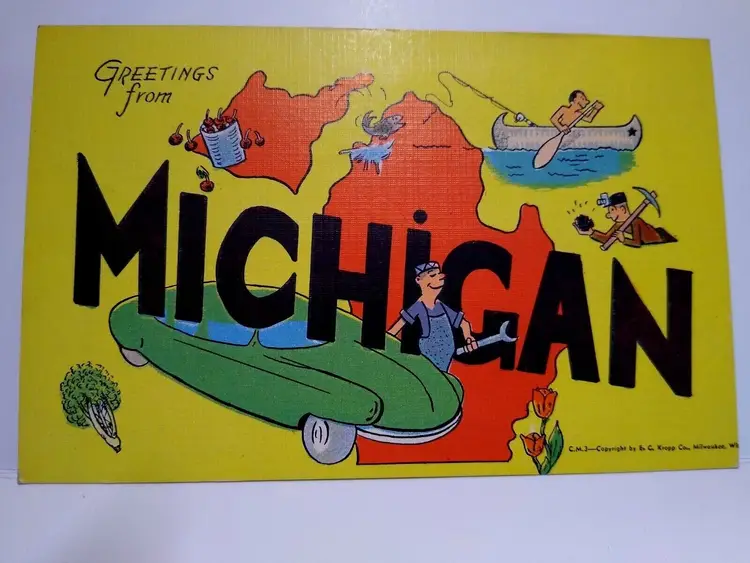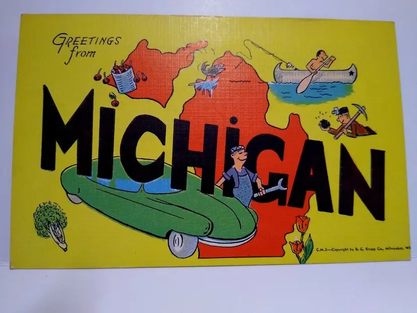 Size: Standard (5.5 x 3.5 in) Custom Bundle: No Continent: North America Region: Michigan Country: USA Type: Linen Postcard Year Manufactured: 1940 Number of Items in Set: 1 Signed: No Original/Licensed Reprint: Original Occasion: Sayings & Quotes City: Multi Time Period Manufactured: 1930's-1950's Unit of Sale: Single Unit Era: Linen (1930-1945) Artist: Unknown Country/Region of Manufacture: United States Material: Paper Theme: Big Letter, Large Letter, Block Letters, Boats, Lake, Automobile, Car, Cities & Towns, Greetings Features: Large Letter Postcard Subject: Large Letter Postage Condition: Unposted Brand/Publisher: EC Kropp Franchise: None