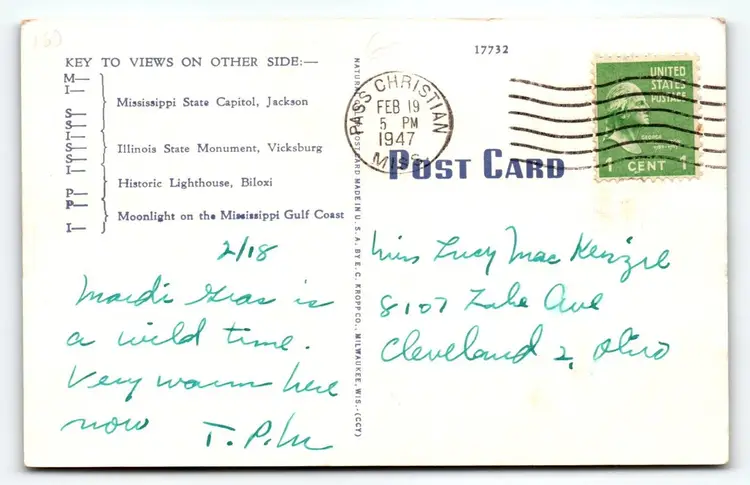 Number of Items in Set: 1 Unit of Sale: Single Unit Artist: Unknown Occasion: Sayings & Quotes Size: Standard (5.5 x 3.5 in) Signed: No Custom Bundle: No Year Manufactured: 1947 Material: Paper City: Multi Original/Licensed Reprint: Original Franchise: None Brand/Publisher: EC Kropp Subject: Large Letter Continent: North America Type: Linen Postcard Era: Linen (1930-1945) Region: Mississippi Country: United States Theme: Art, Cities & Towns, Greetings, Big Letter, Large Letter, Block Letters Features: Large Letter Postcard, Divided Back Time Period Manufactured: 1930's-1950's Country/Region of Manufacture: United States Postage Condition: Posted
