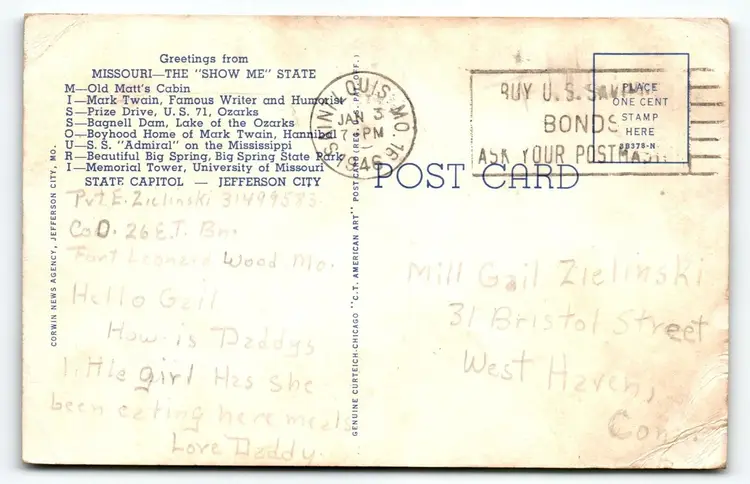 Number of Items in Set: 1 Unit of Sale: Single Unit Artist: Unknown Occasion: Sayings & Quotes Size: Standard (5.5 x 3.5 in) Signed: No Custom Bundle: No Year Manufactured: 1946 Material: Paper City: Multi Original/Licensed Reprint: Original Franchise: Does Not Apply Brand/Publisher: Curt Teich Subject: Large Letter Continent: North America Type: Linen Postcard Era: Linen (1930-1945) Region: Missouri Country: USA Theme: Art, Cities & Towns, Greetings, Big Letter, Large Letter, Block Letters, States Features: Large Letter Postcard Time Period Manufactured: 1930-1945 Country/Region of Manufacture: United States Postage Condition: Posted