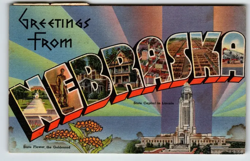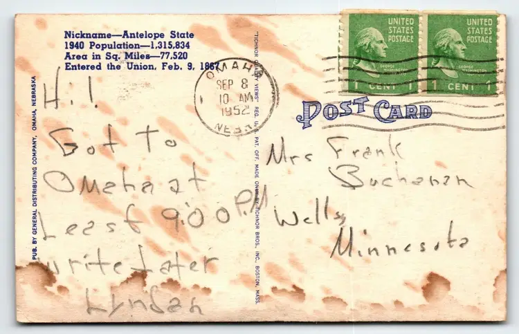 Number of Items in Set: 1 Unit of Sale: Single Unit Artist: Unknown Occasion: Sayings & Quotes Size: Standard (5.5 x 3.5 in) Signed: No Custom Bundle: No Year Manufactured: 1952 Material: Paper City: Multi Original/Licensed Reprint: Original Franchise: None Brand/Publisher: Tichnor Brothers Subject: Large Letter Postcard Continent: North America Type: Linen Postcard Era: Linen (1930-1945) Region: Nebraska Country: USA Theme: Agriculture, Art, Cities & Towns, Greetings, Roadside America, Social History, Tourism, Travel, Big Letter, Large Letter, Block Letters, Mountains, States Features: Large Letter Postcard Time Period Manufactured: 1930's-1950's Country/Region of Manufacture: United States Postage Condition: Posted
