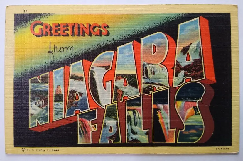 Number of Items in Set: 1 Unit of Sale: Single Unit Artist: Unknown Occasion: Sayings & Quotes Size: Standard (5.5 x 3.5 in) Signed: No Custom Bundle: No Year Manufactured: 1945 Material: Paper City: Niagara Falls Original/Licensed Reprint: Original Franchise: None Brand/Publisher: Curt Teich Subject: Large Letter Continent: North America Type: Linen Postcard Era: Linen (1930-1945) Region: New York Country: USA Theme: Agriculture, Cities & Towns, Greetings, Roadside America, Tourism, Travel, Big Letter, Large Letter, Block Letters, Buildings Features: Large Letter Postcard Time Period Manufactured: 1930's-1950's Country/Region of Manufacture: United States Postage Condition: Unposted