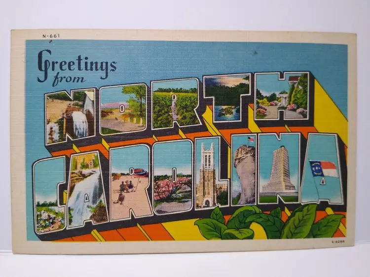 Size: Standard (5.5 x 3.5 in) Custom Bundle: No Continent: North America Region: North Carolina Country: USA Type: Linen Postcard Year Manufactured: 1945 Number of Items in Set: 1 Signed: No Original/Licensed Reprint: Original Occasion: Sayings & Quotes City: Various Time Period Manufactured: 1930's-1950's Unit of Sale: Single Unit Era: Linen (1930-1945) Artist: Unknown Country/Region of Manufacture: United States Material: Paper Theme: Big Letter, Large Letter, Block Letters, Agriculture, Cities & Towns, Greetings Features: Large Letter Postcard Subject: Large Letter Postage Condition: Unposted Brand/Publisher: Asheville Franchise: None