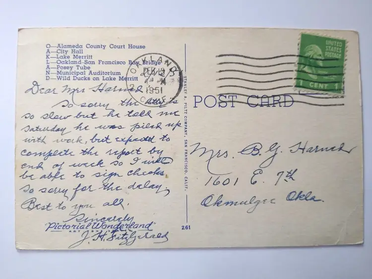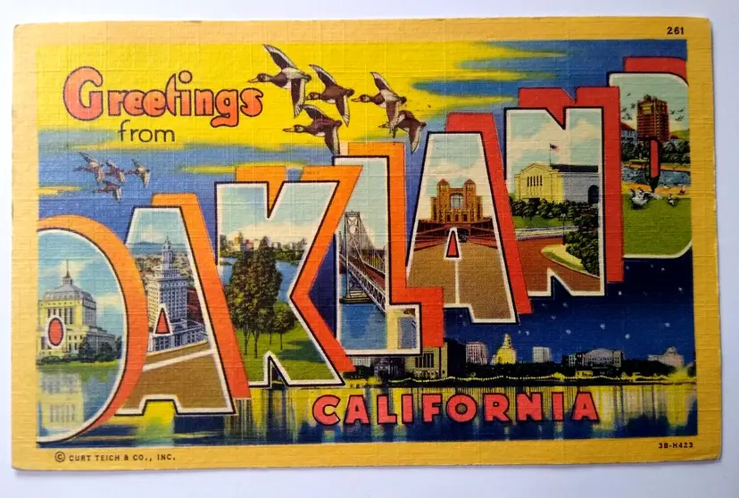Number of Items in Set: 1 Unit of Sale: Single Unit Artist: Unknown Occasion: Sayings & Quotes Size: Standard (5.5 x 3.5 in) Signed: No Custom Bundle: No Year Manufactured: 1951 Material: Paper City: Oakland Original/Licensed Reprint: Original Franchise: None Brand/Publisher: Curt Teich Subject: Large Letter Continent: North America Type: Linen Postcard Era: Linen (1930-1945) Region: California Country: USA Theme: Agriculture, Big Letter, Block Letters, Cities & Towns, Flowers & Plants, Greetings, Large Letter, Woods Features: Divided Back, Large Letter Postcard, Cities, Towns Time Period Manufactured: 1930's-1950's Country/Region of Manufacture: United States Postage Condition: Posted