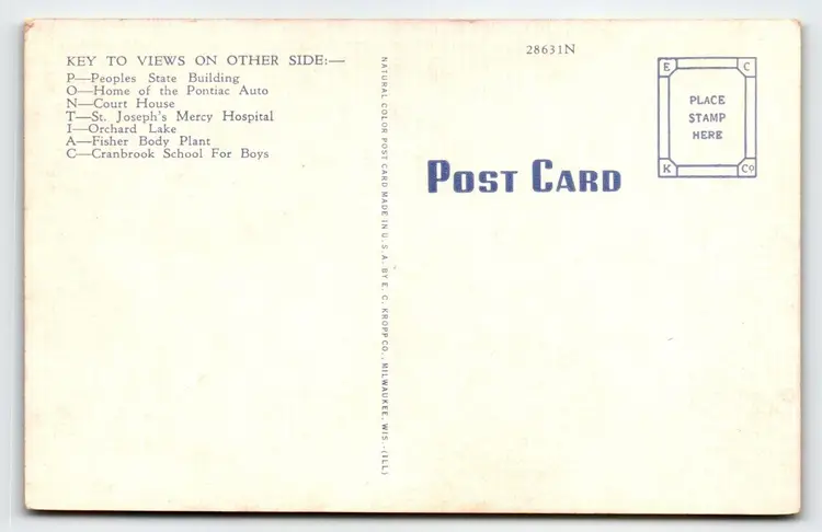 Number of Items in Set: 1 Unit of Sale: Single Unit Artist: Unknown Occasion: Sayings & Quotes Size: Standard (5.5 x 3.5 in) Signed: No Custom Bundle: No Year Manufactured: 1949 Material: Paper City: Pontiac Original/Licensed Reprint: Original Franchise: Unknown Brand/Publisher: EC Kropp Subject: Greetings Continent: North America Type: Linen Postcard Era: Post-War (1945-Now) Region: Michigan Country: USA Theme: Architecture, Art, Cities & Towns, Greetings, Landscapes, Social History, Big Letter, Large Letter, Block Letters, Buildings, States Features: Large Letter Postcard, Greetings, Greetings From, Big Letter Time Period Manufactured: 1930's-1950's Country/Region of Manufacture: United States Postage Condition: Unposted