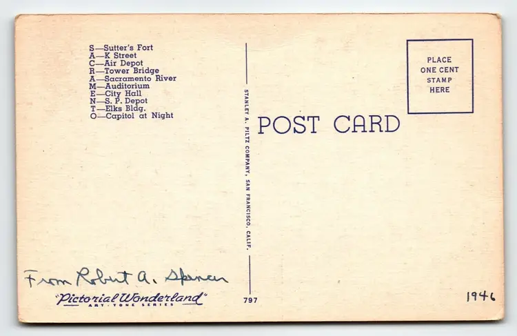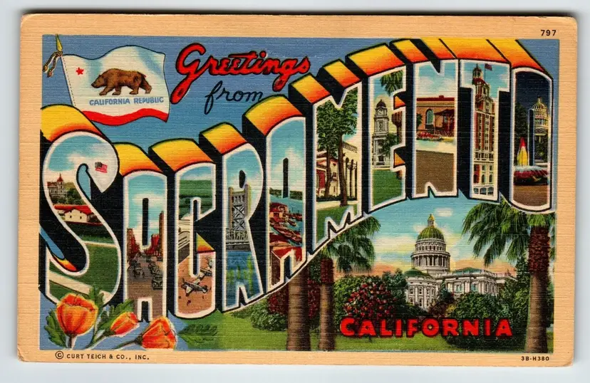 Number of Items in Set: 1 Unit of Sale: Single Unit Artist: Unknown Occasion: Sayings & Quotes Size: Standard (5.5 x 3.5 in) Signed: No Custom Bundle: No Year Manufactured: 1949 Material: Paper City: Sacramento Original/Licensed Reprint: Original Franchise: None Brand/Publisher: Curt Teich Subject: Large Letter Continent: North America Type: Linen Postcard Era: Linen (1930-1945) Region: California Country: USA Theme: Agriculture, Architecture, Art, Big Letter, Block Letters, Cities & Towns, Greetings, Large Letter, Roadside America, Tourism, Travel Features: Divided Back, Large Letter Postcard, Cities, Towns Time Period Manufactured: 1930's-1950's Country/Region of Manufacture: United States Postage Condition: Posted
