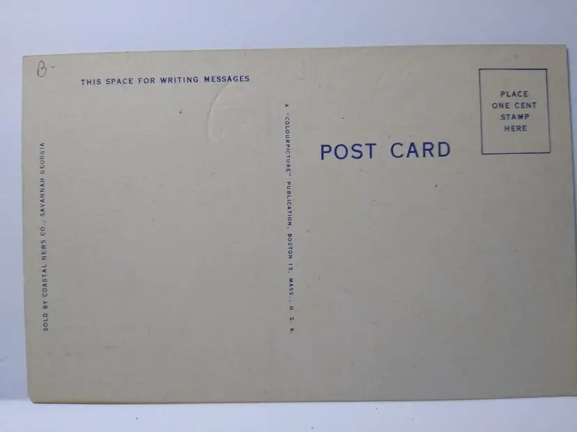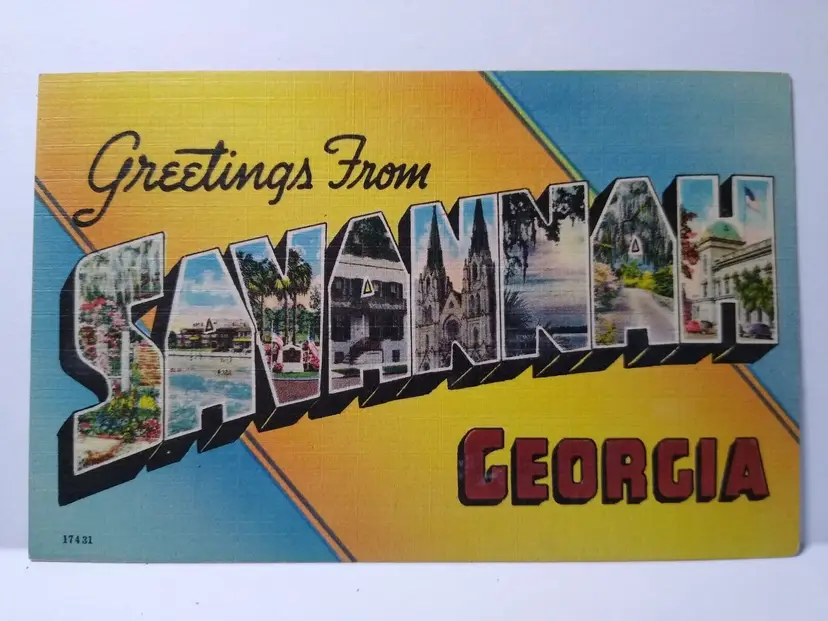 Size: Standard (5.5 x 3.5 in) Custom Bundle: No Continent: North America Region: Georgia Country: USA Type: Linen Postcard Year Manufactured: 1942 Number of Items in Set: 1 Signed: No Original/Licensed Reprint: Original Occasion: Sayings & Quotes City: Savannah Time Period Manufactured: 1930's-1950's Unit of Sale: Single Unit Era: Linen (1930-1945) Artist: Unknown Country/Region of Manufacture: United States Material: Paper Theme: Big Letter, Large Letter, Block Letters, Agriculture, Cities & Towns, Greetings Features: Large Letter Postcard, Cities, Towns, Divided Back Subject: Large Letter Postage Condition: Unposted Brand/Publisher: Colourpicture Franchise: None