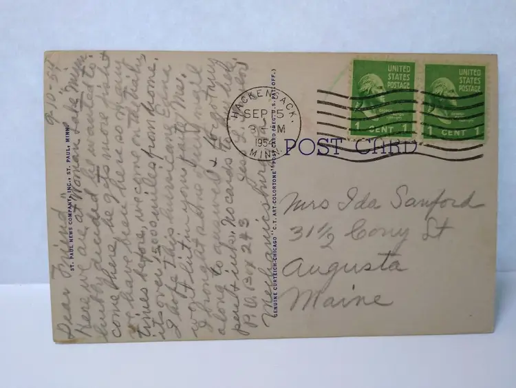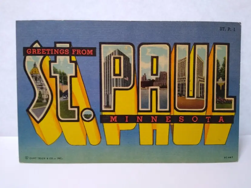 Size: Standard (5.5 x 3.5 in) Custom Bundle: No Continent: North America Region: Minnesota Country: USA Type: Linen Postcard Year Manufactured: 1954 Number of Items in Set: 1 Signed: No Original/Licensed Reprint: Original Occasion: Sayings & Quotes City: St. Paul Time Period Manufactured: 1930-1945 Unit of Sale: Single Unit Era: Linen (1930-1945) Artist: Unknown Country/Region of Manufacture: United States Material: Paper Theme: Big Letter, Large Letter, Block Letters, Greetings Features: Large Letter Postcard Subject: Large Letter Postage Condition: Posted Brand/Publisher: Curt Teich Franchise: Does Not Apply