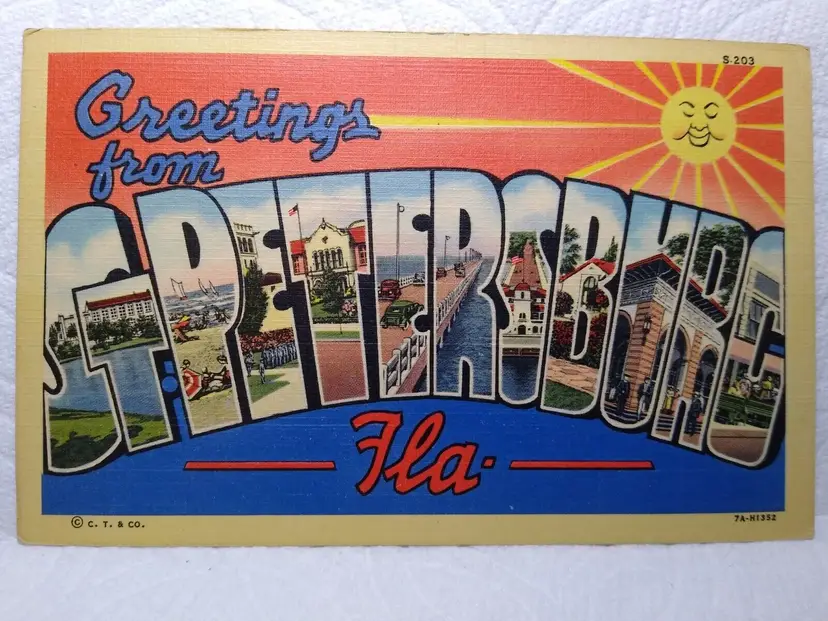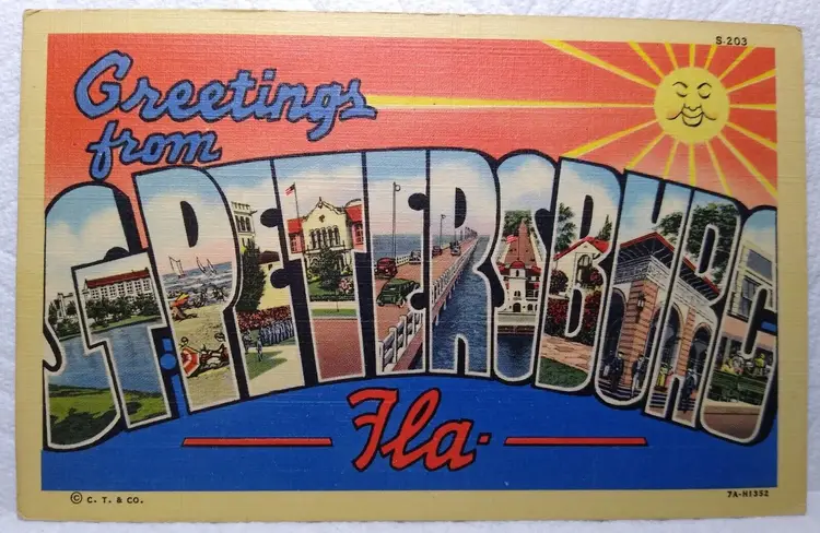 Number of Items in Set: 1 Unit of Sale: Single Unit Artist: Unknown Occasion: Sayings & Quotes Size: Standard (5.5 x 3.5 in) Signed: No Custom Bundle: No Year Manufactured: 1945 Material: Paper City: St Petersburg Original/Licensed Reprint: Original Franchise: None Brand/Publisher: Curt Teich Subject: Large Letter Continent: North America Type: Linen Postcard Era: Linen (1930-1945) Region: Florida Country: USA Theme: Cities & Towns, Greetings, Big Letter, Large Letter, Block Letters, Scenic, Beach, Beach Town, Ocean Features: Large Letter Postcard Time Period Manufactured: 1930's-1950's Country/Region of Manufacture: United States Postage Condition: Unposted