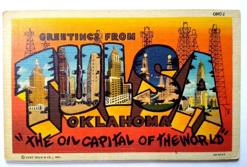 Number of Items in Set: 1 Unit of Sale: Single Unit Artist: Unknown Occasion: Sayings & Quotes Size: Standard (5.5 x 3.5 in) Signed: No Custom Bundle: No Year Manufactured: 1940 Material: Paper City: Tulsa Original/Licensed Reprint: Original Franchise: None Brand/Publisher: Curt Teich Subject: Large Letter Continent: North America Type: Printed (Lithograph) Era: Linen (1930-1945) Region: Oklahoma Country: United States Theme: Agriculture, Architecture, Art, Cities & Towns, Cowboys & Western, Greetings, Roadside America, Tourism, Travel, Big Letter, Large Letter, Block Letters Features: Large Letter Postcard, Divided Back Time Period Manufactured: 1930's-1950's Country/Region of Manufacture: United States Postage Condition: Unposted
