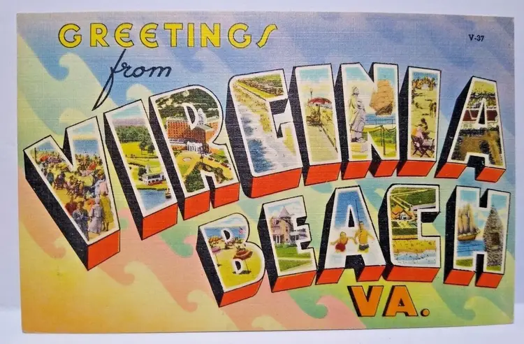 Size: Standard (5.5 x 3.5 in) Custom Bundle: No Continent: North America Region: Virginia Country: USA Type: Linen Postcard Year Manufactured: 1945 Number of Items in Set: 1 Signed: No Original/Licensed Reprint: Original Occasion: Sayings & Quotes City: Virginia Beach Time Period Manufactured: 1930's-1950's Unit of Sale: Single Unit Era: Linen (1930-1945) Artist: Unknown Country/Region of Manufacture: United States Material: Paper Theme: Big Letter, Large Letter, Block Letters, Agriculture, Cities & Towns, Greetings Features: Large Letter Postcard Subject: Large Letter Postage Condition: Unposted Brand/Publisher: Tichnor Brothers Franchise: None