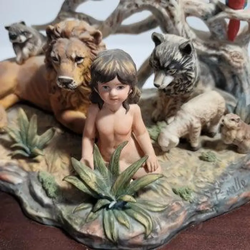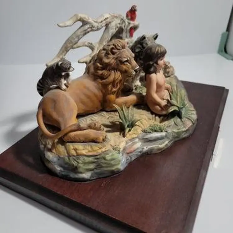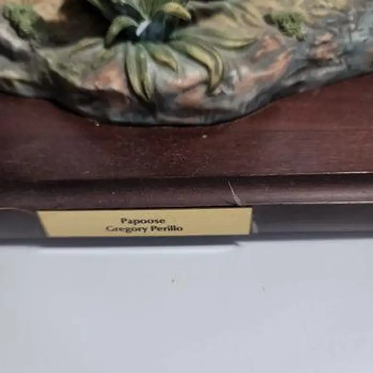 Gregory Perillo Papoose Figurine features animals and a child. sets on a wood platform with a tag on the front and has a small scratch tag on the wood also looks like a small part of the end of the leaves may have broken off. Pre-own and in great condition except for the 2 issues.