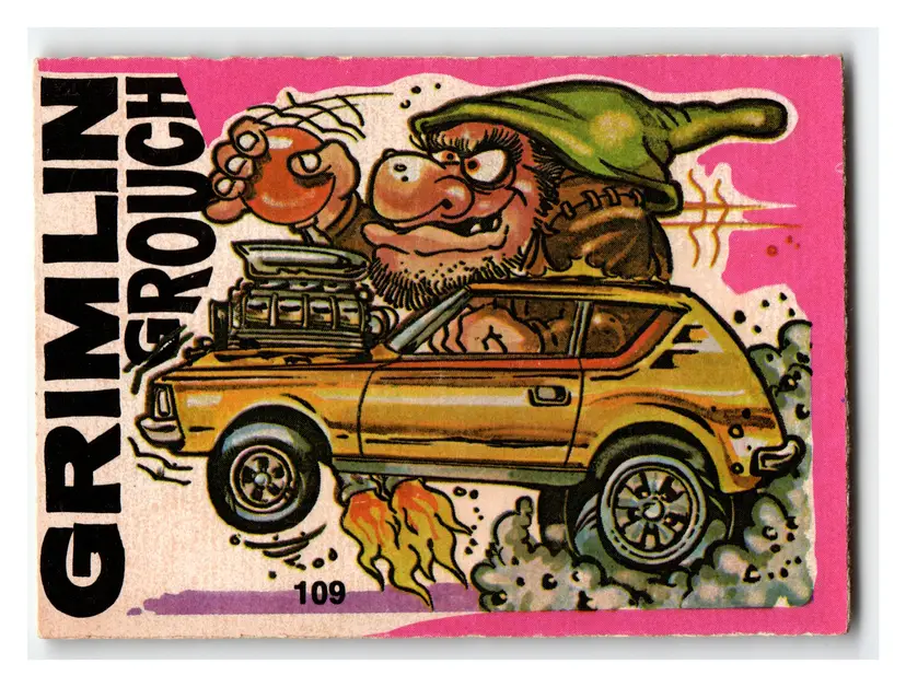 This listing features a unique Gremlin Grouch sticker single, identified as number 109. The sticker showcases a humorous, monster-like character, the "Gremlin Grouch," behind the wheel of a customized hot rod car. The car, reminiscent of a classic AMC Gremlin, is depicted with an exaggerated engine and flames bursting from the rear, suggesting speed and power. The vibrant pink background adds to its vintage appeal.