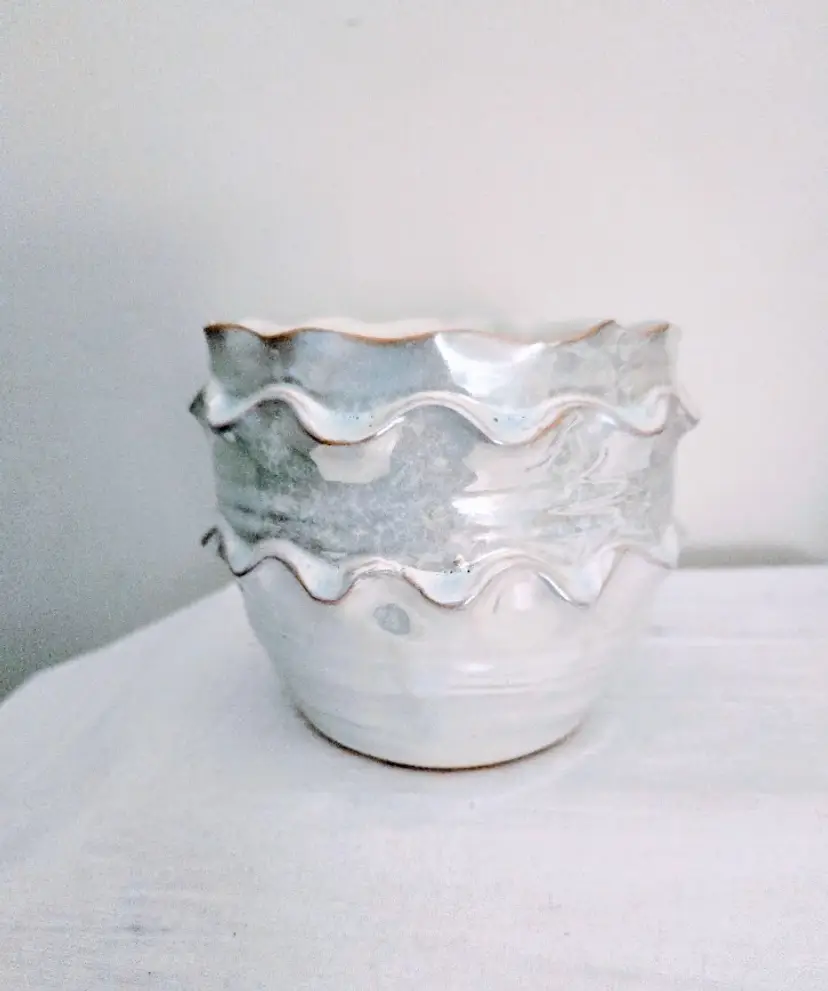 This product is a stylish and elegant 4" round grey and white iridescent ruffle pottery planter or vase.