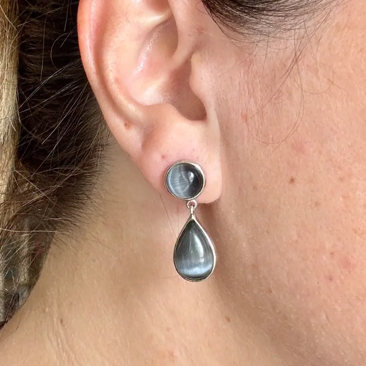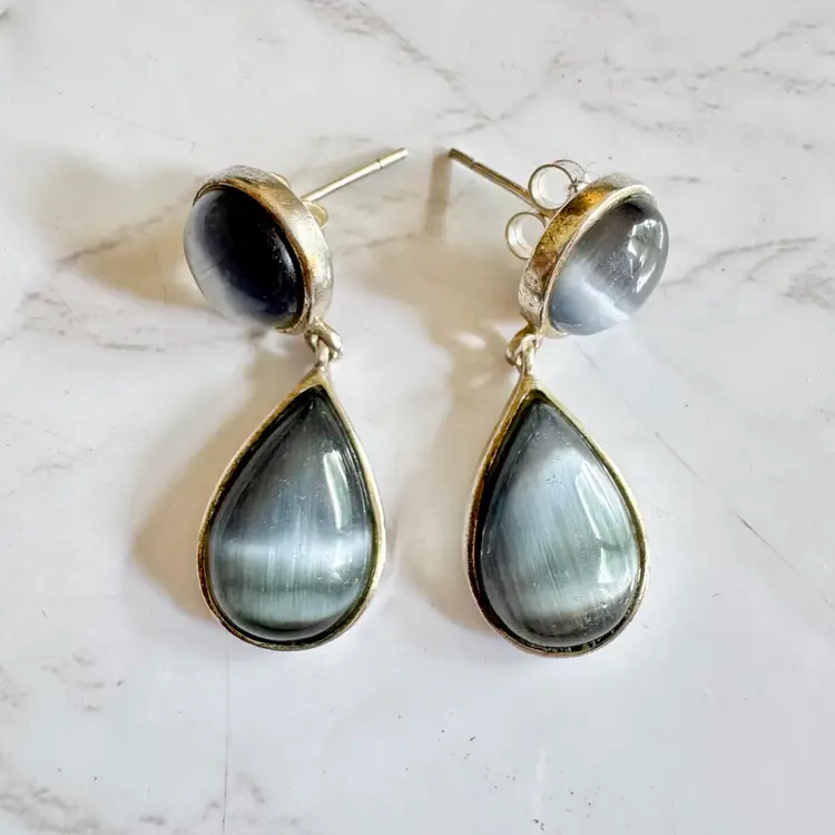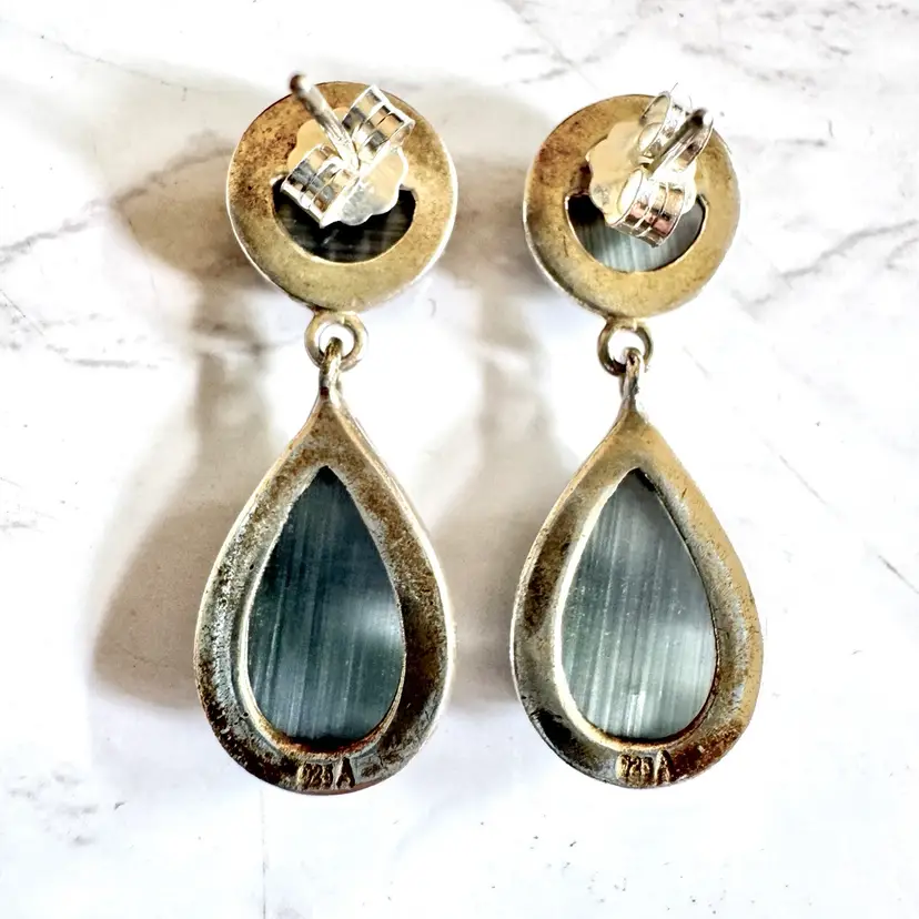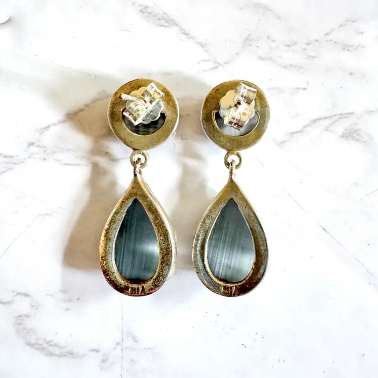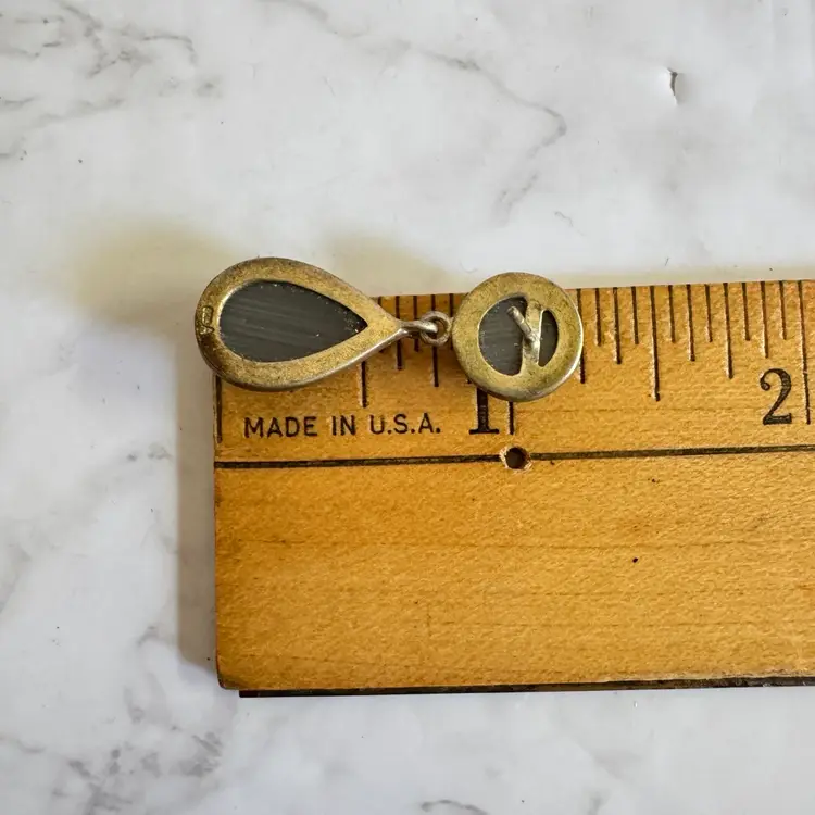 About 1” drop, 6g, tested as sterling silver, signs of wear indicative of age.