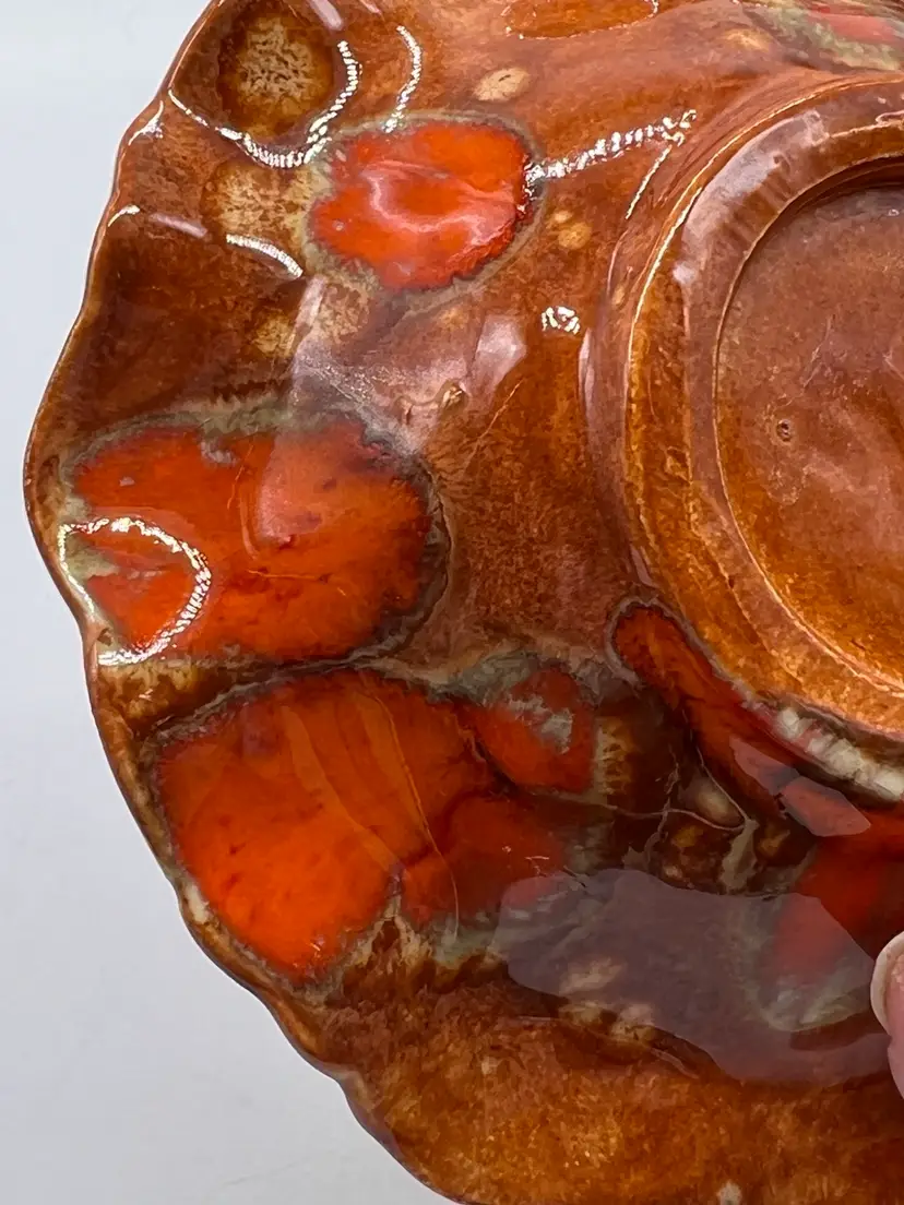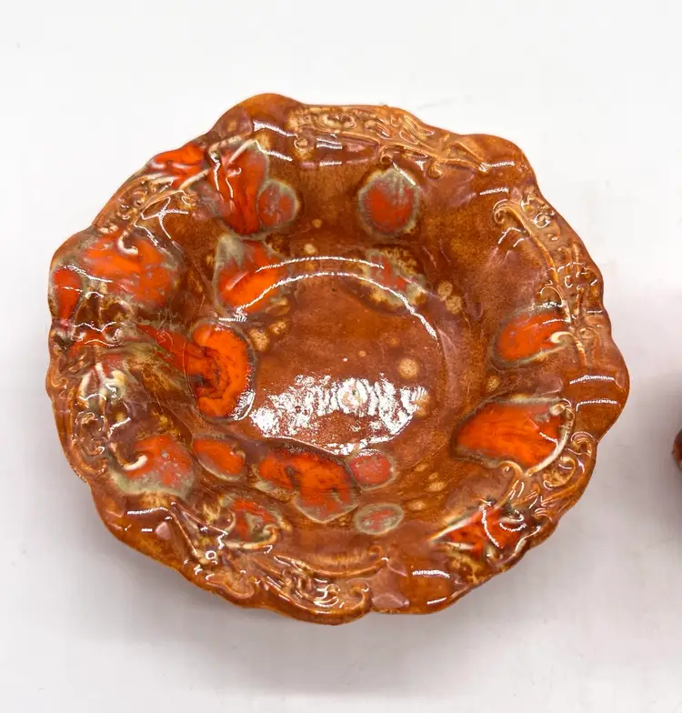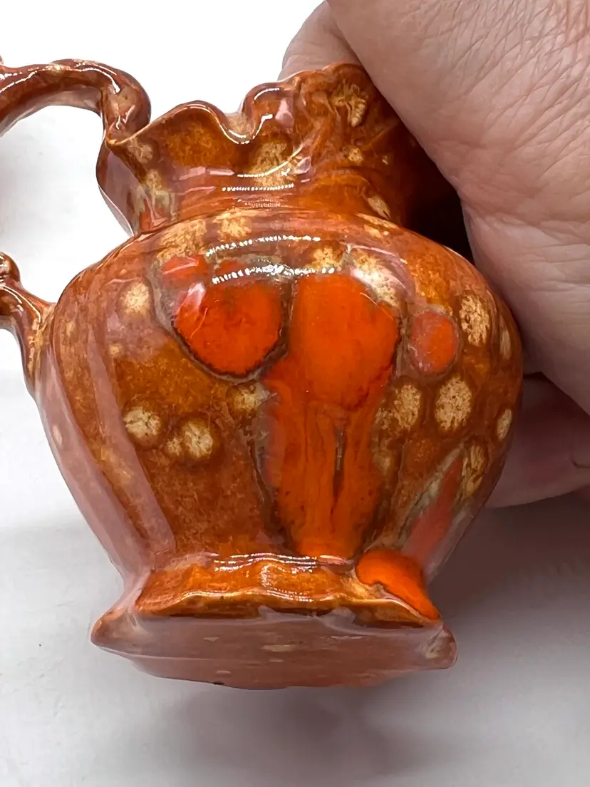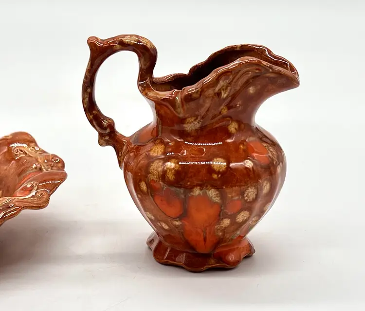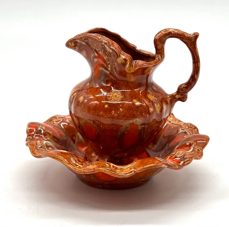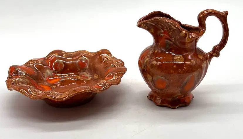 Groovy orange drip glaze pitcher and bowl. 4 1/2” tall. No chips or cracks