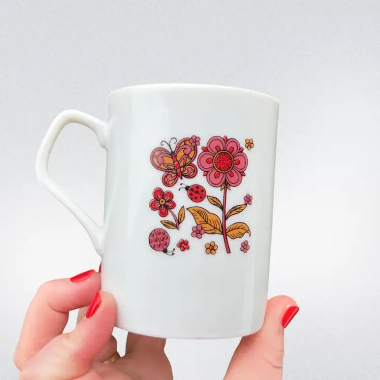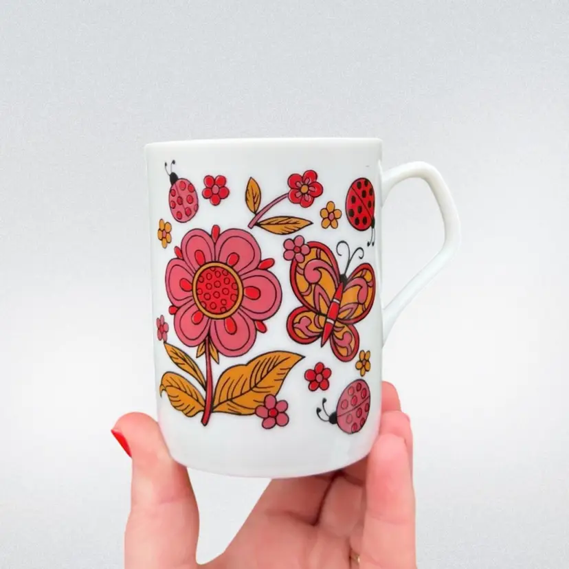 Super cute vintage flower power mug, likely made in Japan. Features groovy flowers, butterflies and lady bugs! About 3.5in tall- slightly smaller than an average sized mug.