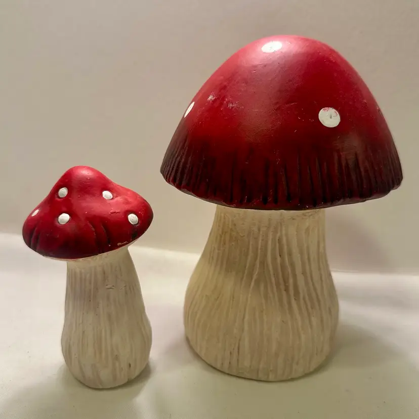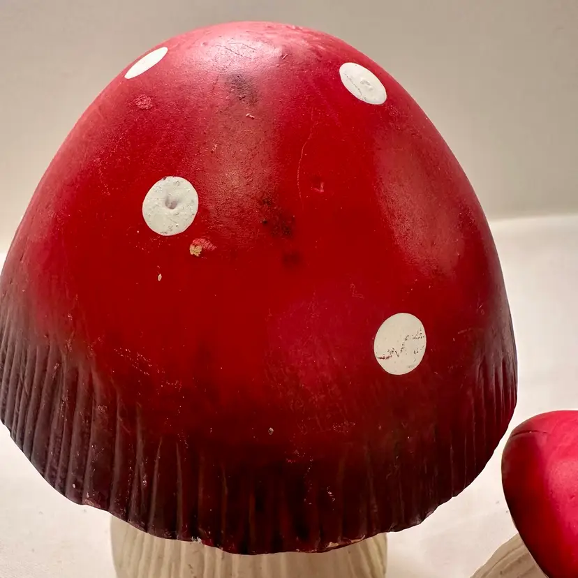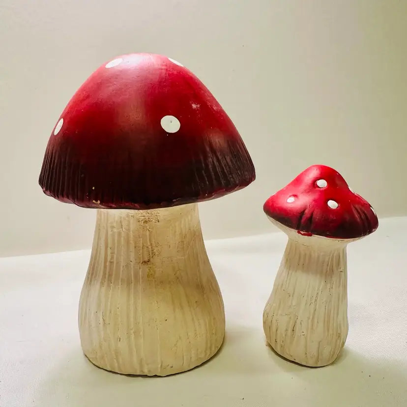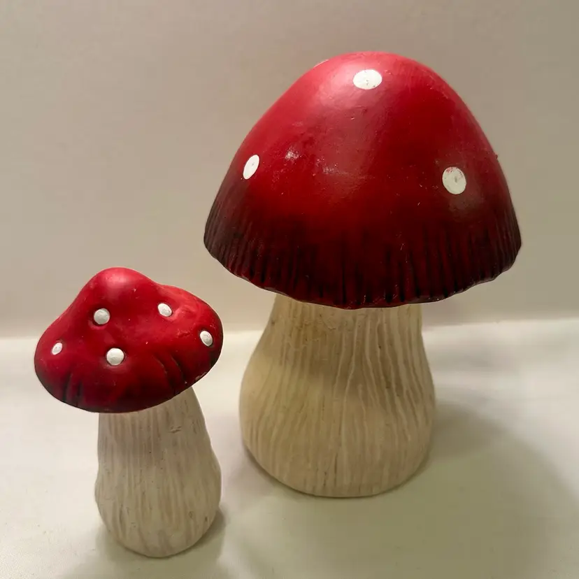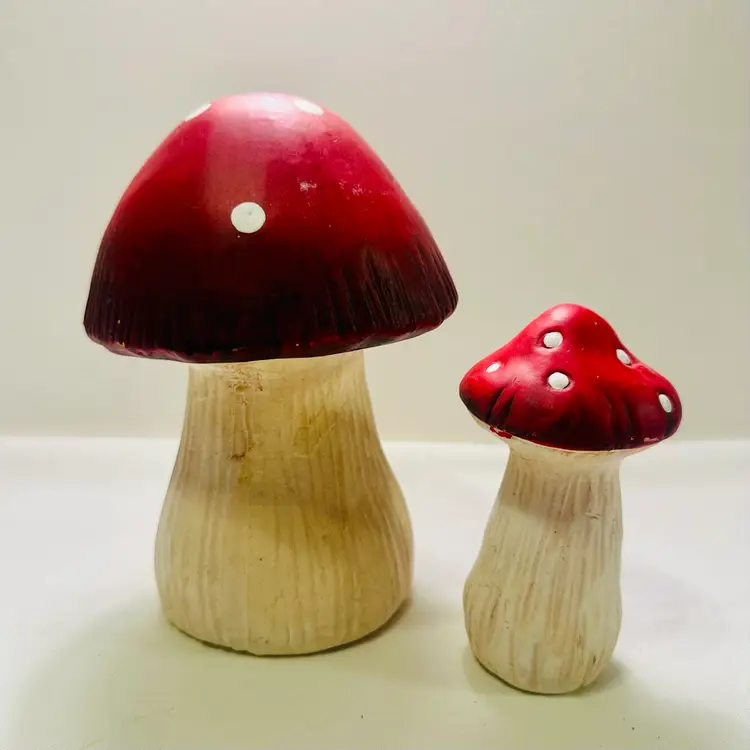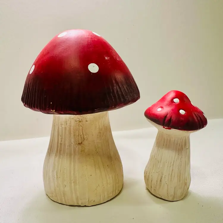 This listing is for two groovy retro ceramic red and white mushroom yard art decorations.