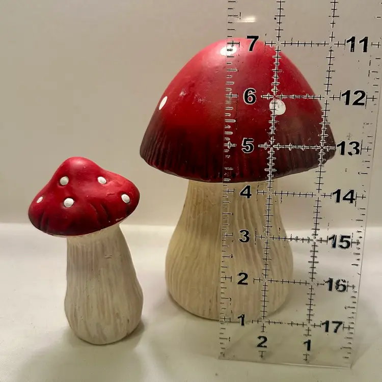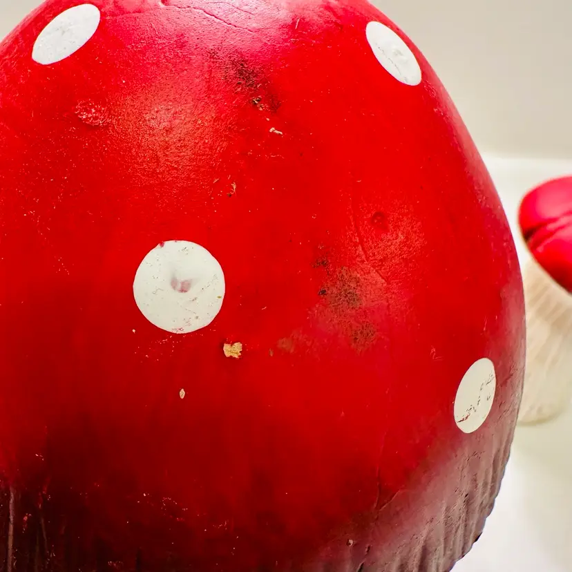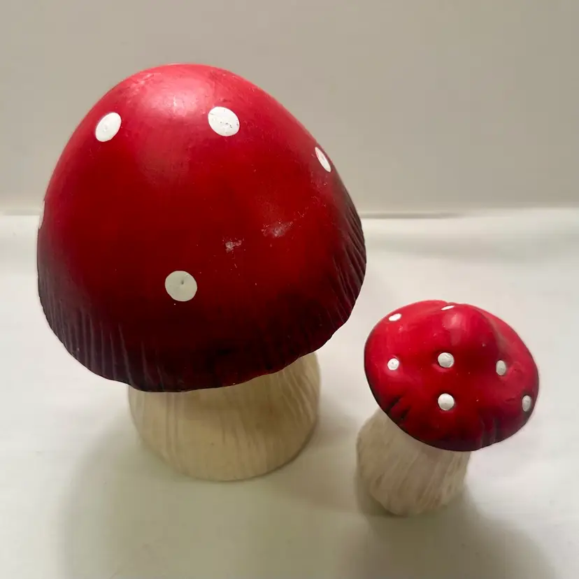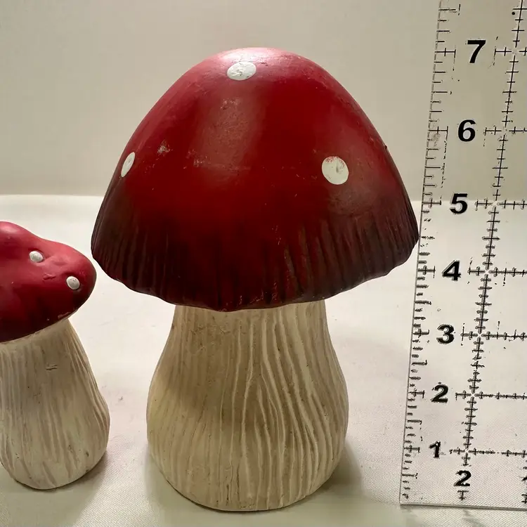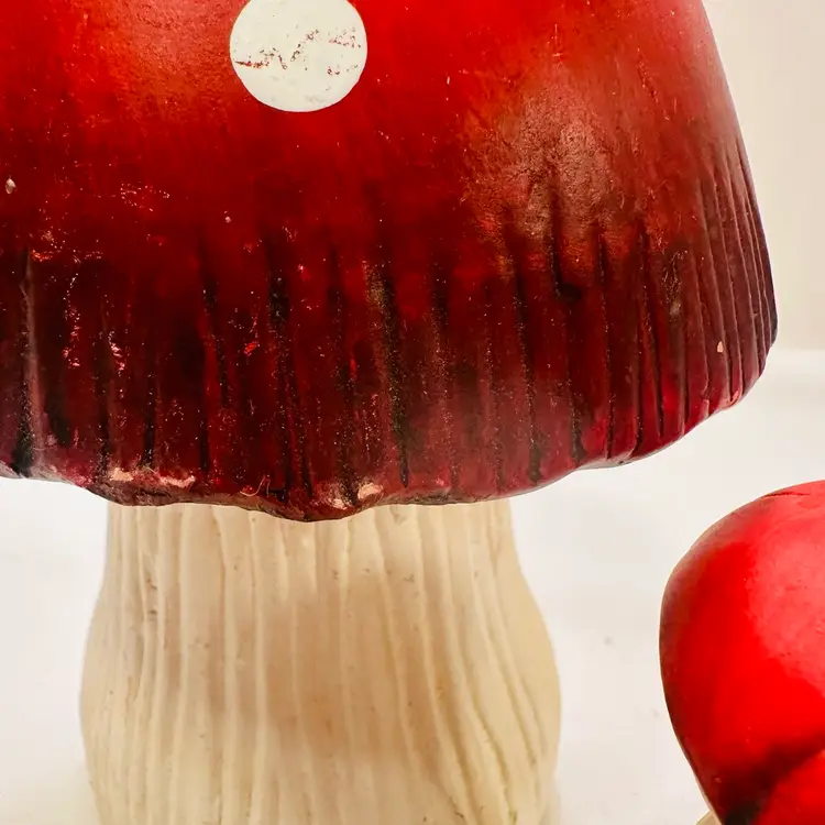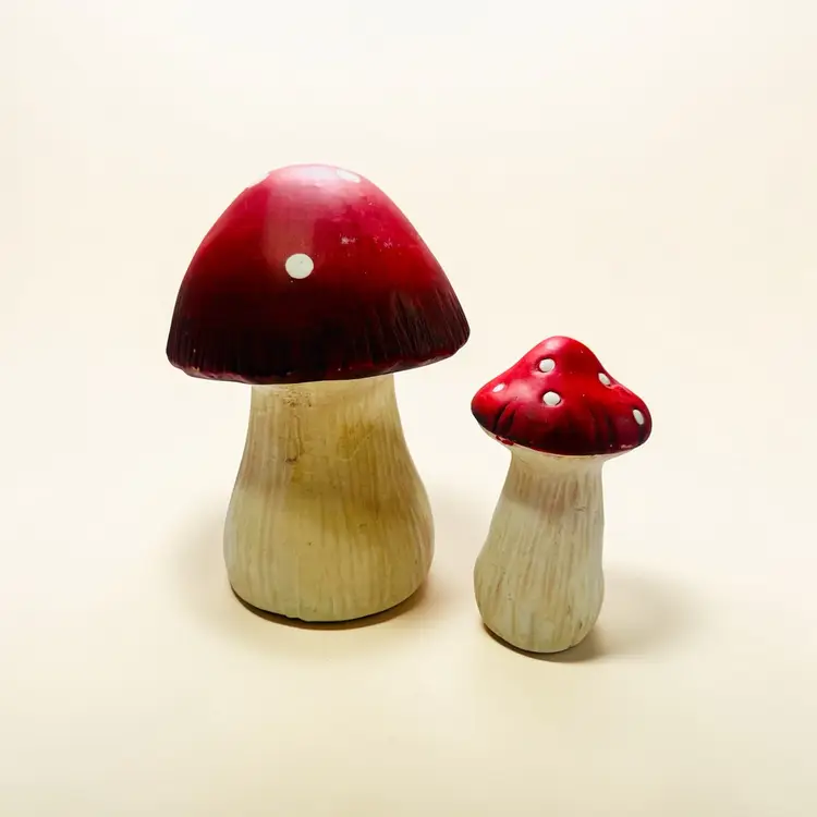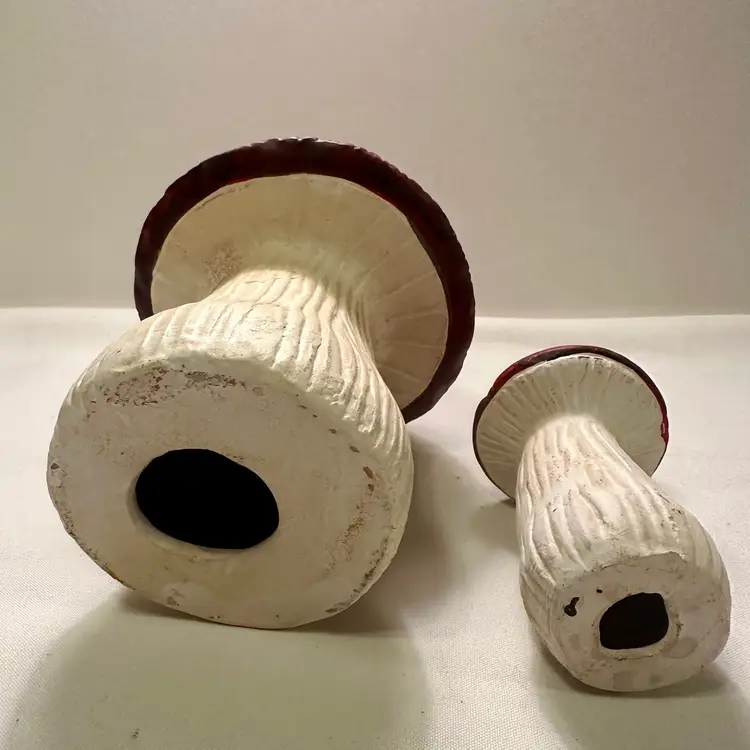 This listing is for two groovy retro ceramic red and white mushroom yard art decorations.