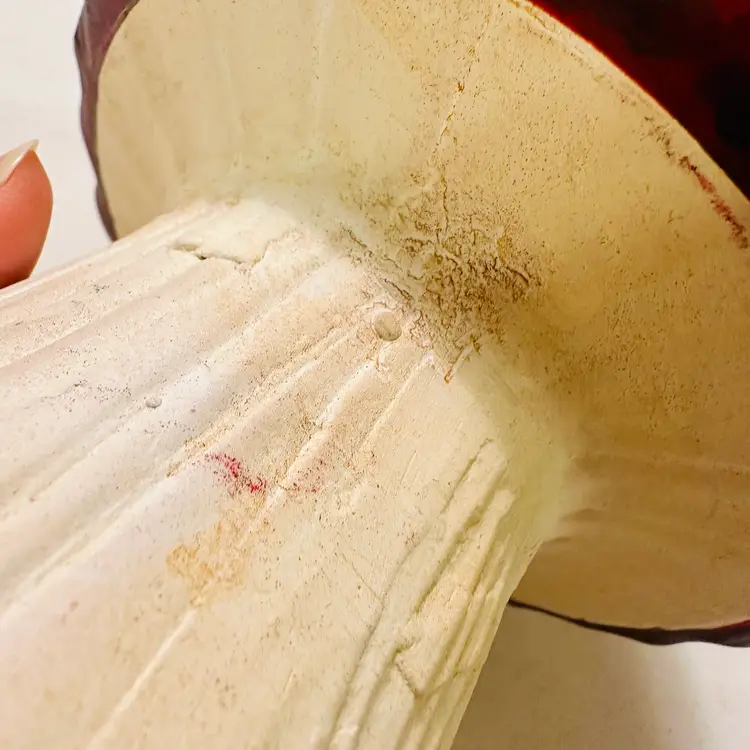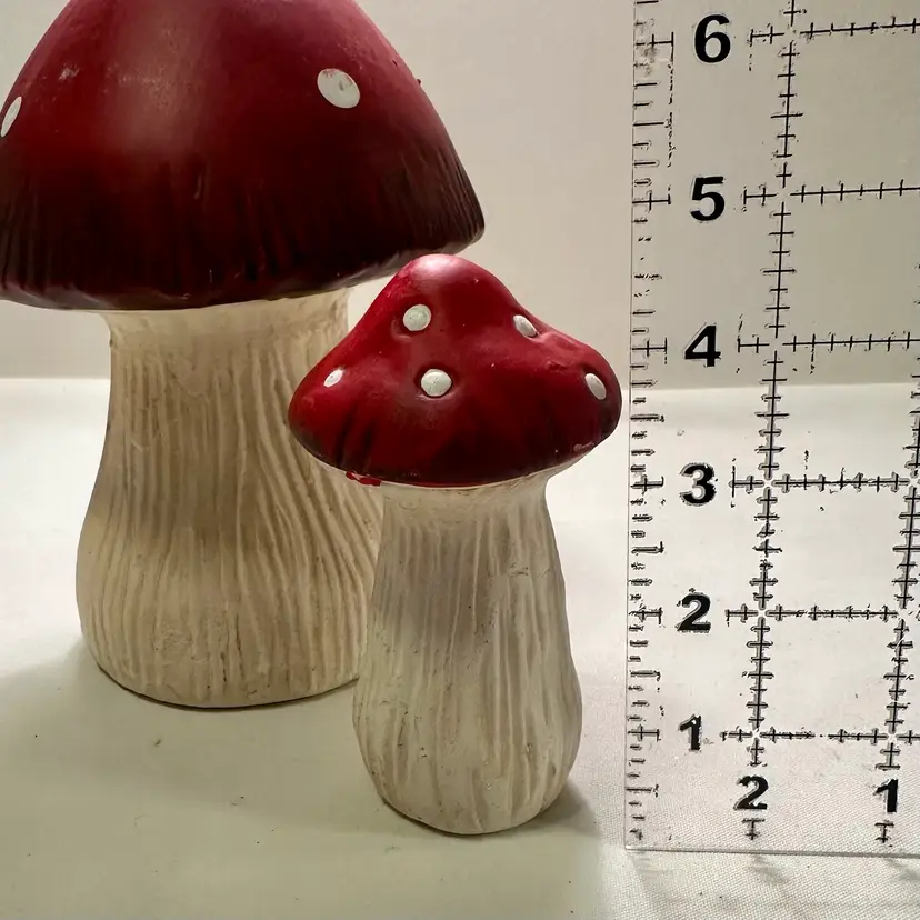 The larger mushroom is approximately 7” tall while the smaller one is approximately 5” tall. They are in good condition, no nicks or cracks, just some wear signs but minimal. Needs good cleaning.
