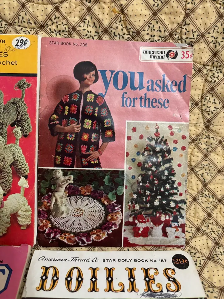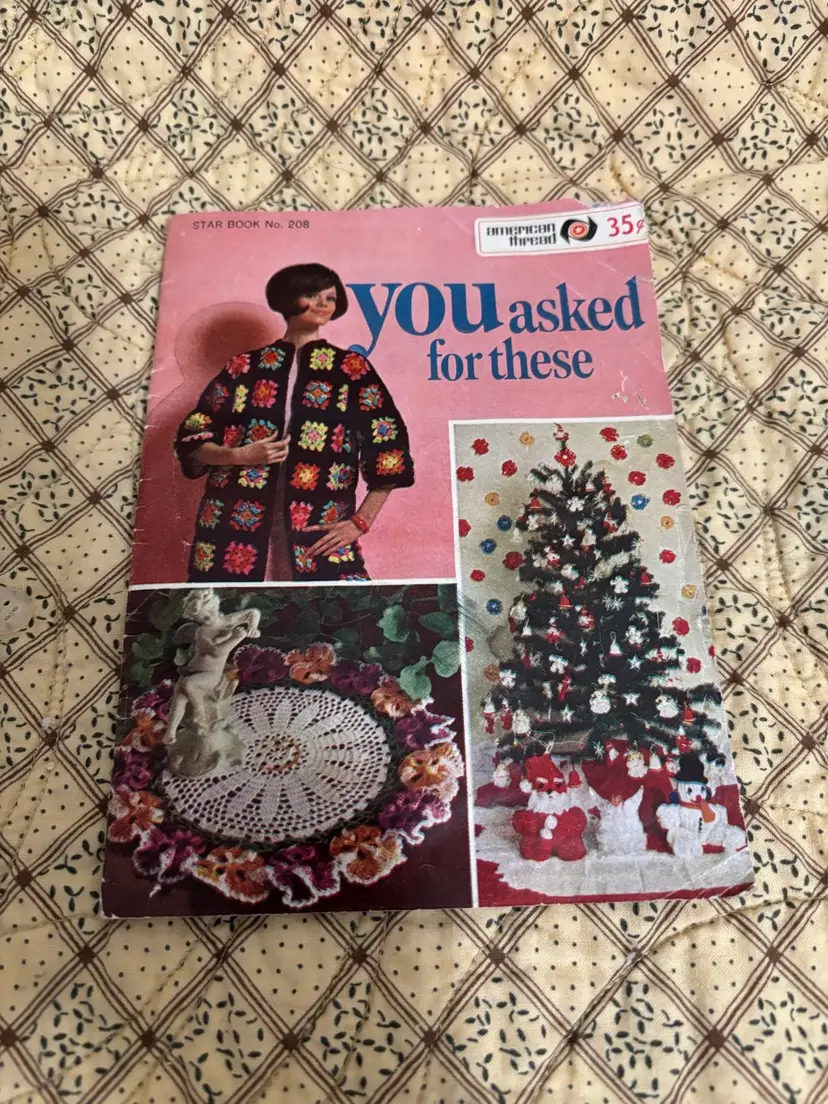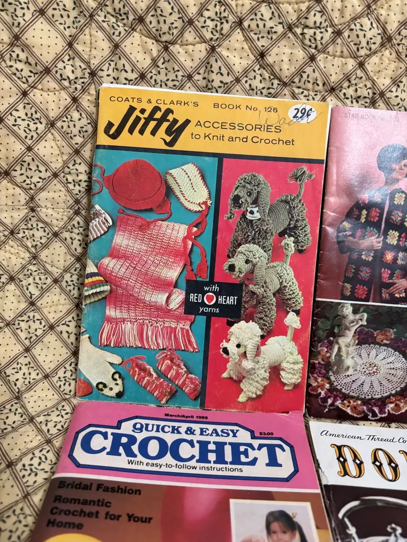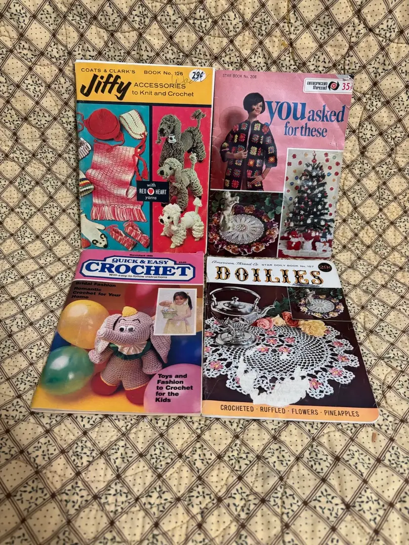 Get your crochet hooks and knitting needles out! These are 4 fun instruction books to make whimsical and lovely items. Dating from the 1960’s. From animals, bridal gowns and accessories to shawls and doilies. Great to pass time browsing through. “You Asked for These” book has straining on pages. Usual vintage wear with creases on some page corners and 2 have a bit of spine separations.