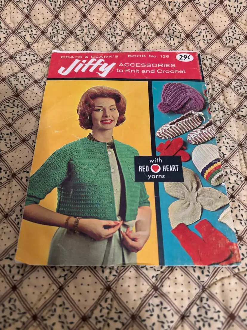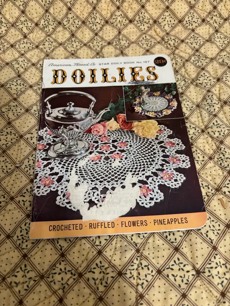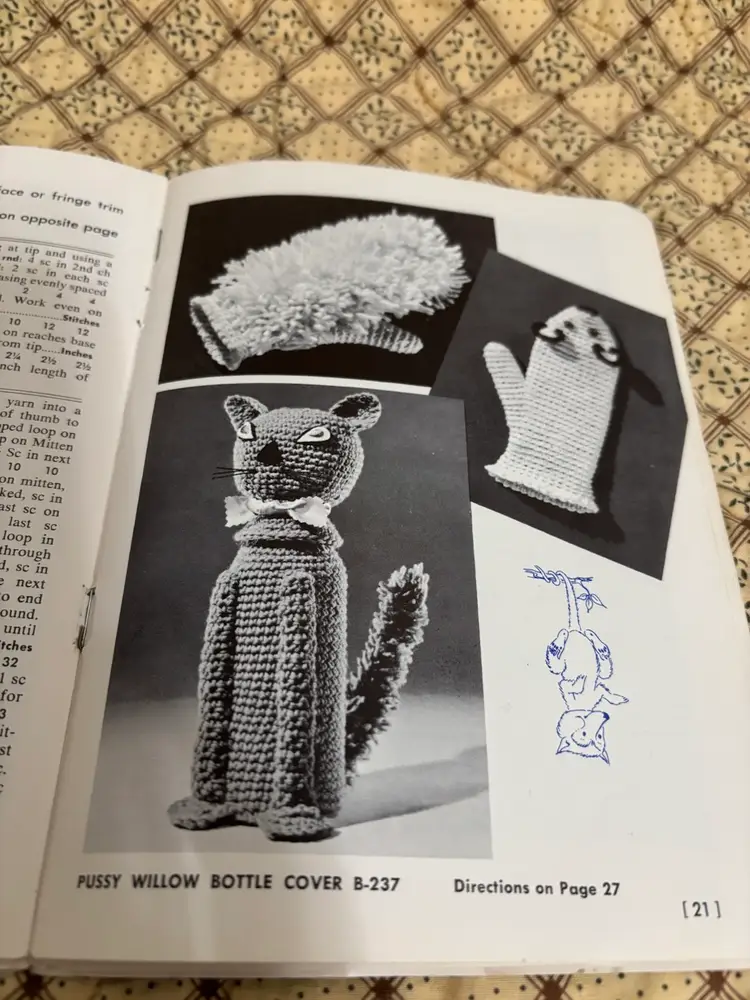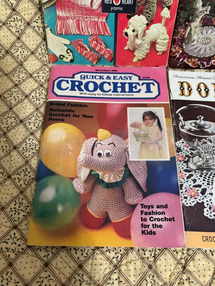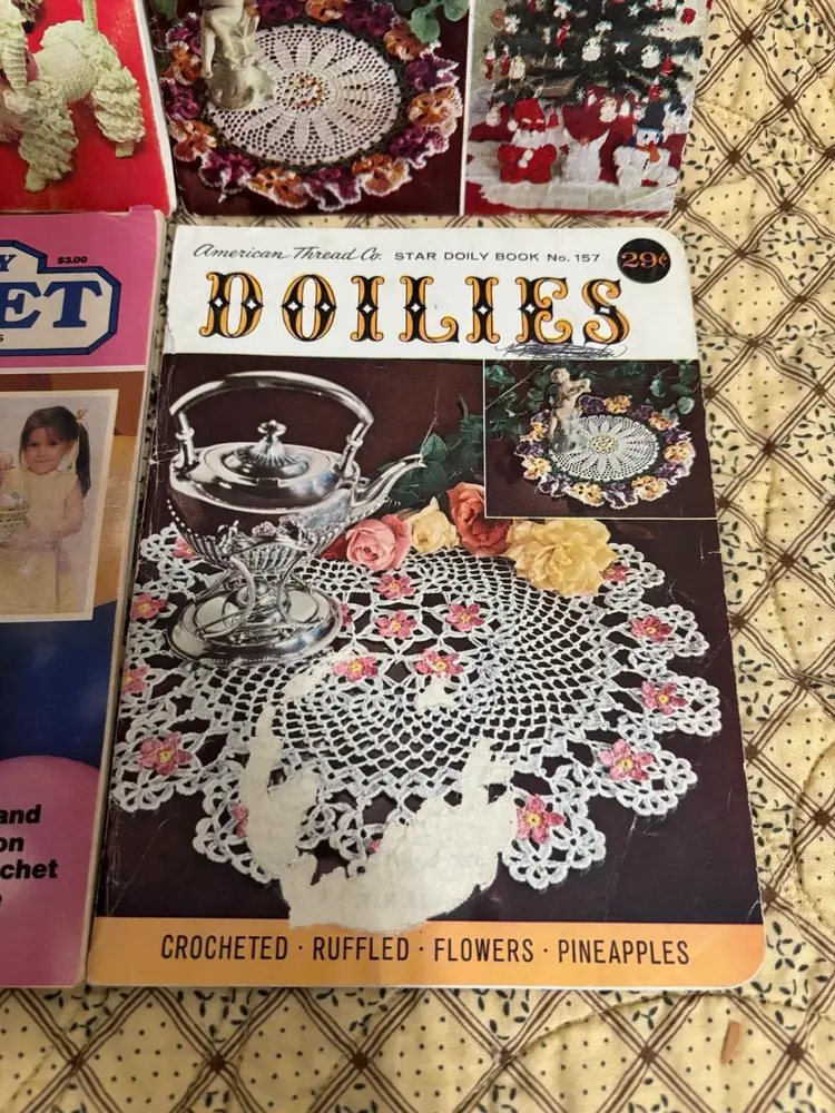 Get your crochet hooks and knitting needles out! These are 4 fun instruction books to make whimsical and lovely items. Dating from the 1960’s. From animals, bridal gowns and accessories to shawls and doilies. Great to pass time browsing through. “You Asked for These” book has straining on pages. Usual vintage wear with creases on some page corners and 2 have a bit of spine separations.